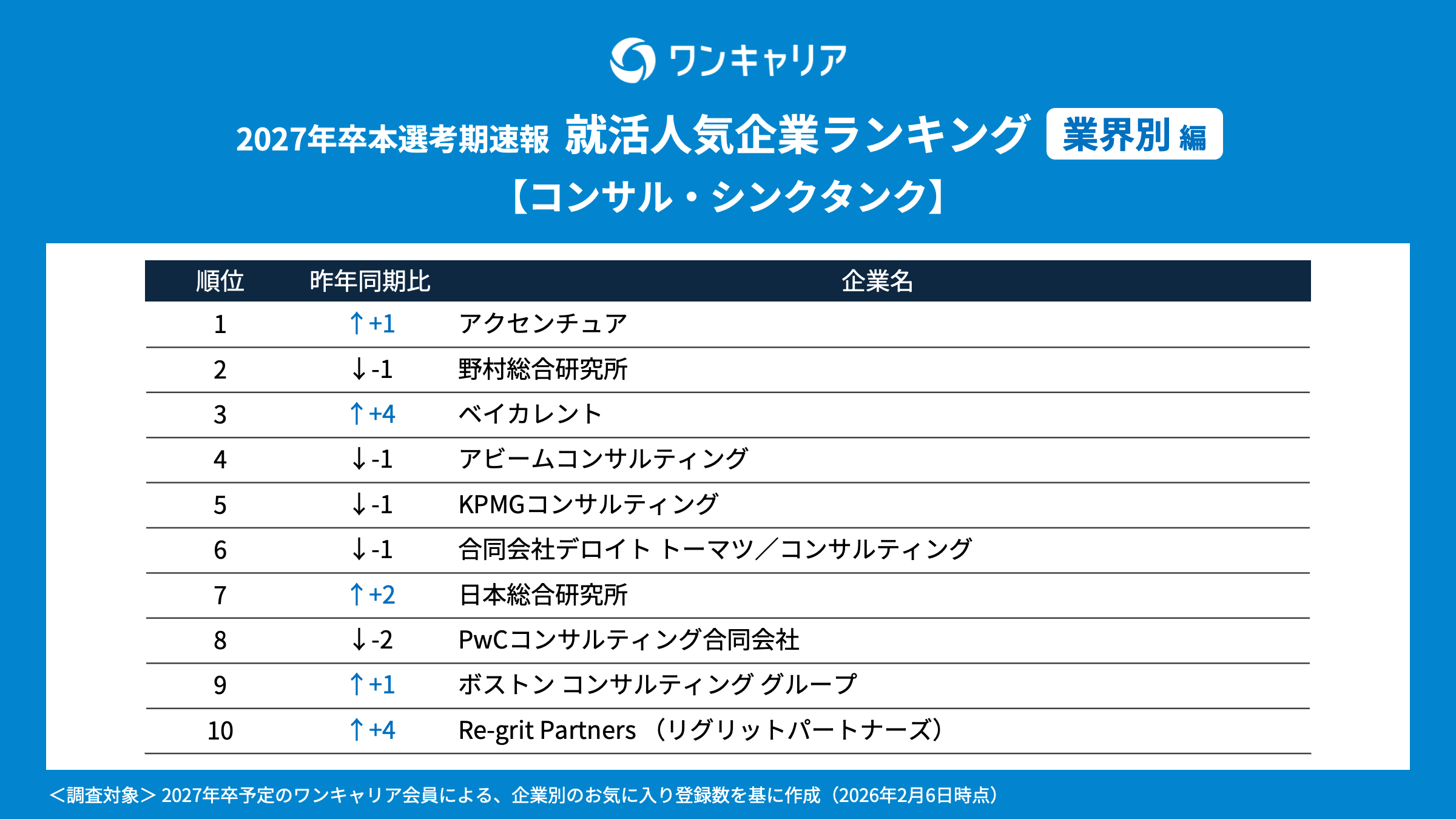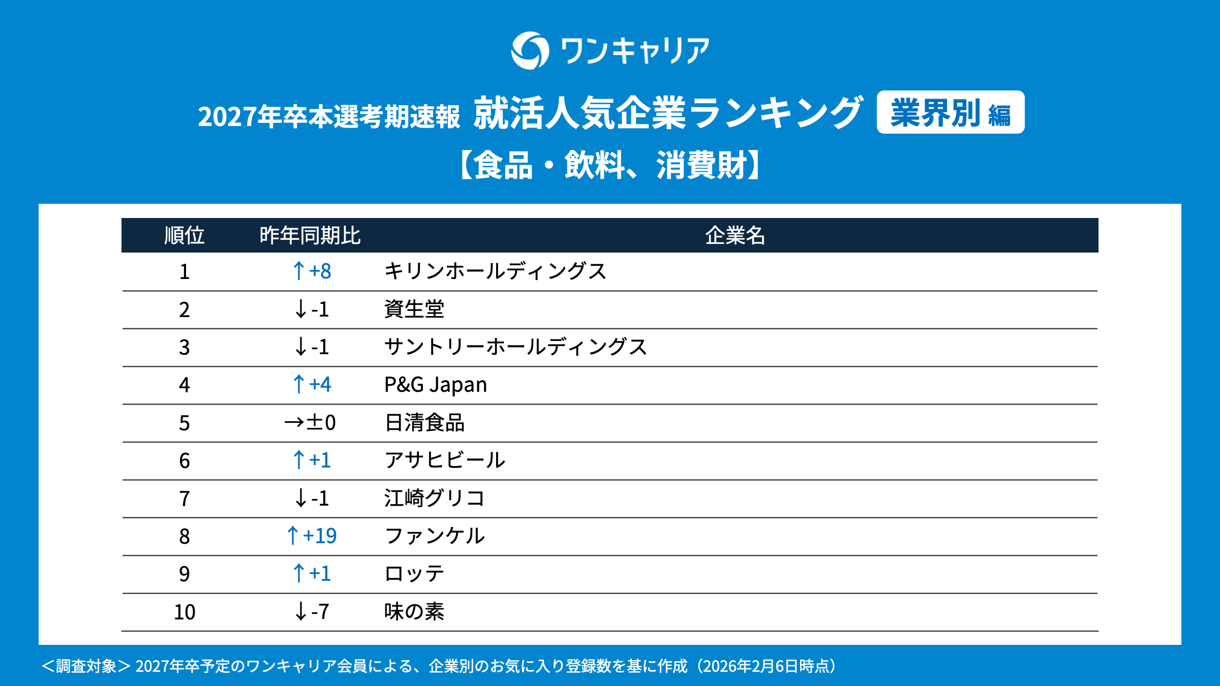調査概要 ・調査名:ワンキャリア 就活人気企業ランキング【業界別編】(27卒本選考期速報) ・調査時期:2026年2月6日時点での実績値を参照 ・調査対象:就活支援サービス「ワンキャリア」のユーザーで、2027年3月卒業見込みの大学3年生・大学院1年生 ・調査方法:就活支援サービス「ワンキャリア」の企業ページ上の「お気に入り数」を基に集計 ・有効回答者数:120,094名