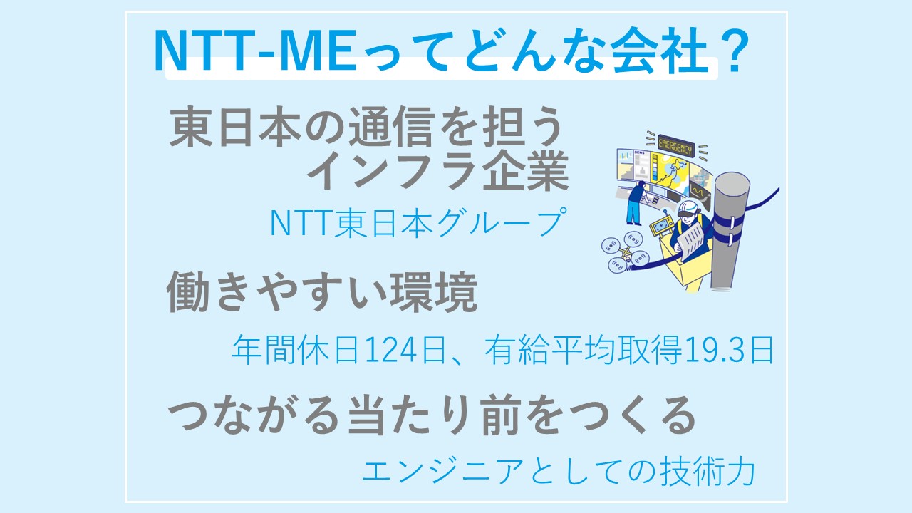 私たちNTT-MEは地域に根ざしたネットワークカンパニーとして、情報通信領域において、最高品質のネットワークとそれを支える高度なエンジニアリング力で、地域の皆様に安心・安全で信頼性の高いサービスを提供してきた、NTT東日本グループの会社です。その豊富な実績と確かな技術をベースに、これからのデジタル社会を支え、地域に密着した現場力やAIなどの先端技術、ソフトウェアを駆使して、地域の新しい価値創造に貢献していきます。私たちと一緒に、人と暮らしとまちの未来にとって持続可能な循環型社会の共創を目指しましょう!
