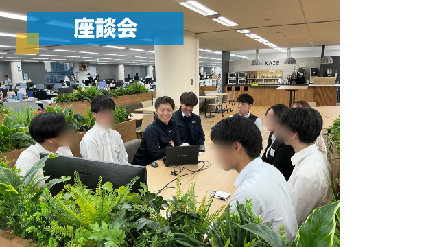 ・先輩社員との座談会:ざっくばらんな質問コーナーを実施。実際に働く社員の生の声を聞くことで、社風の理解を深め働くイメージを掴む。