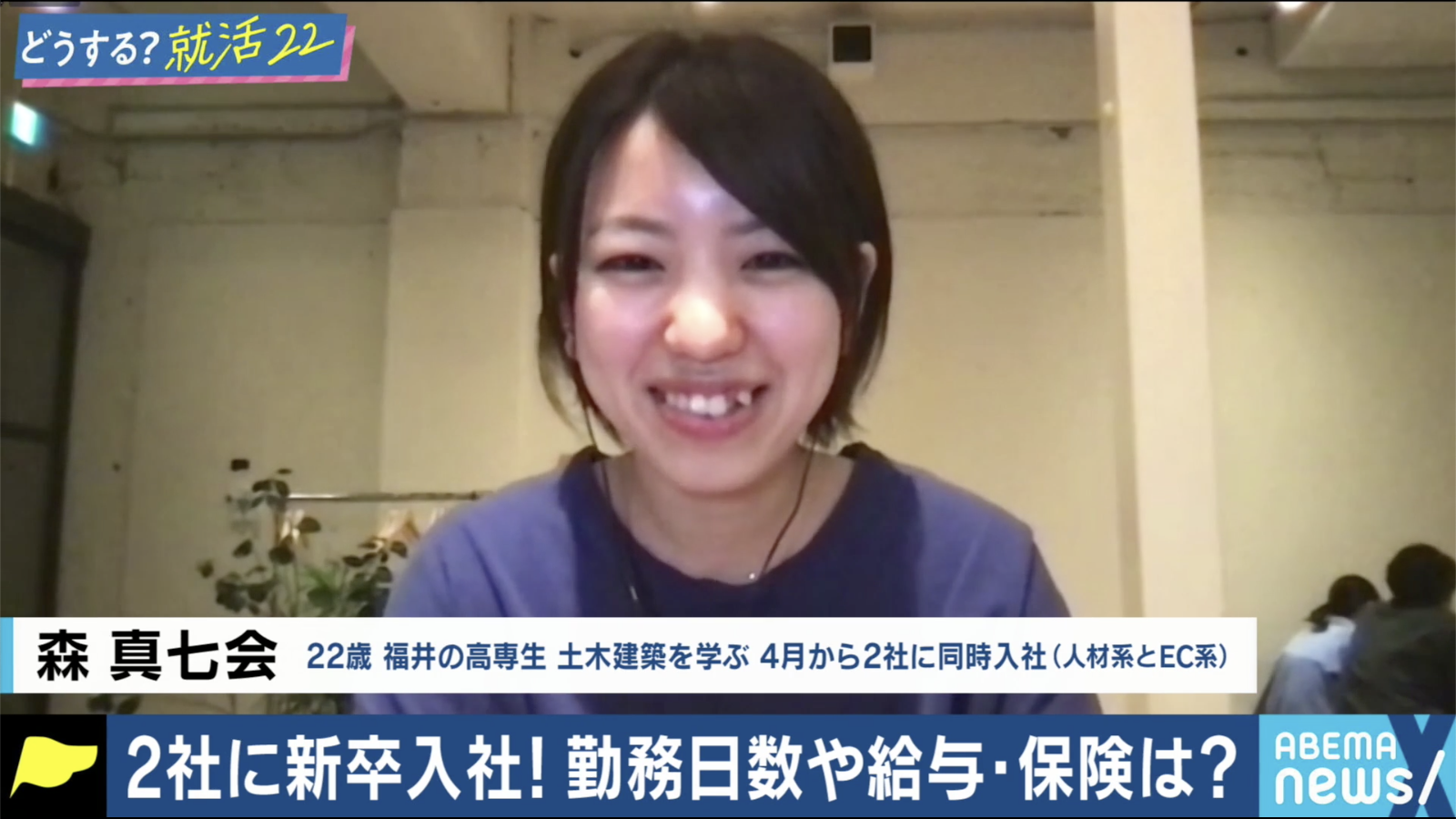 中学校を卒業後、福井県の高等専門学校に進学。7年間にわたり土木建築を学んだ森真七会さん(22)は、4月から社会人になる。森さんが他の新卒と違うのは「2社に就職する」という点だ。一体どういうことだろうか。