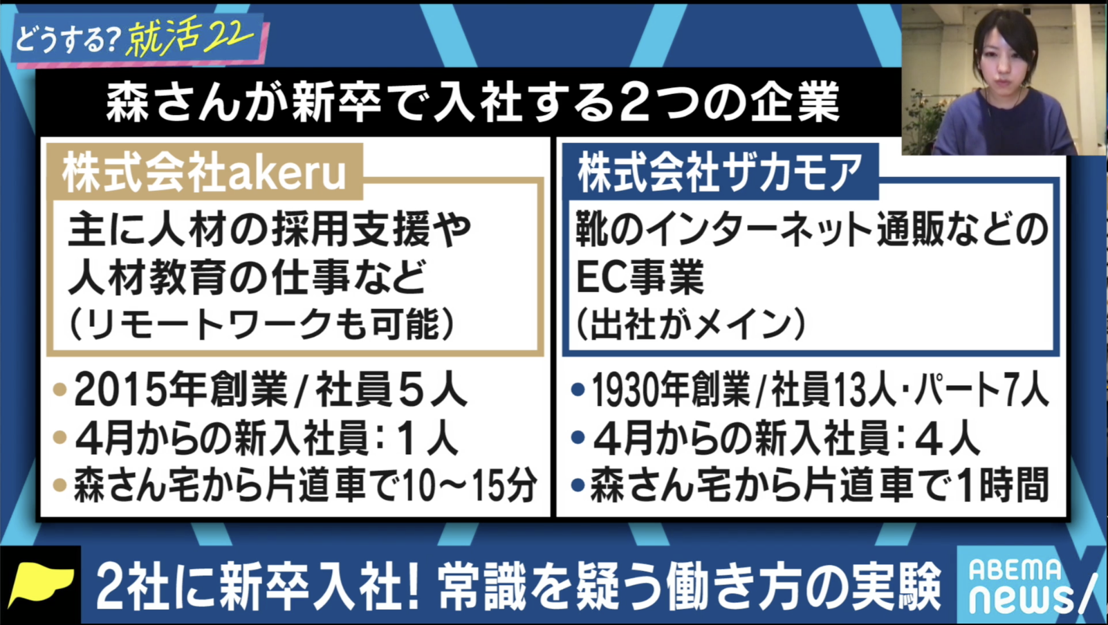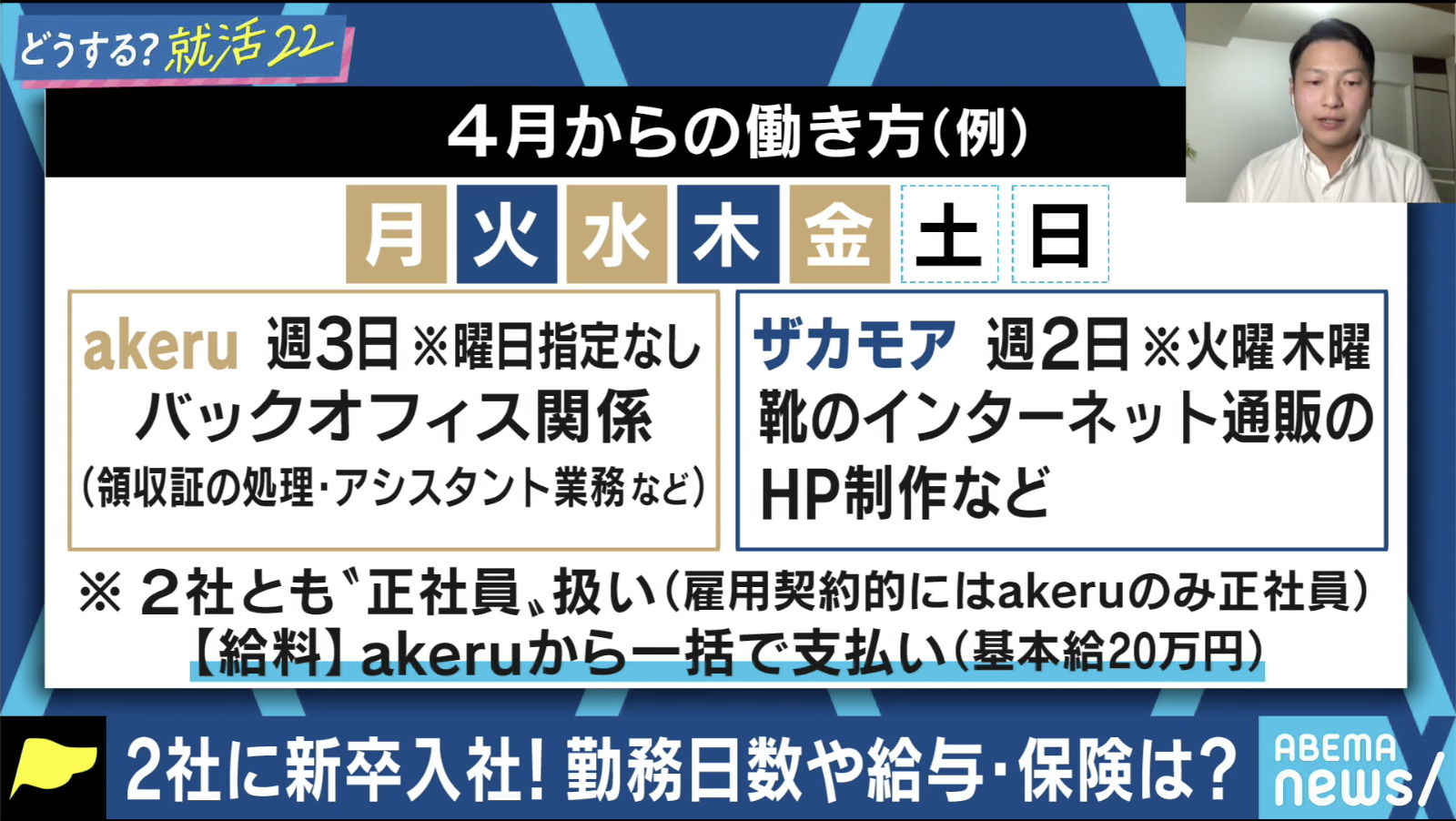前代未聞の2社で新卒社員になることになった森さんは「メチャクチャ不安だ。覚えることは2倍だし、前の日の仕事が残ったまま、もう片方に出社しちゃうなとか。だから入ってみたらつらくて辞めたいなと思うタイミングも出てくるかもしれない。でも、2社同時だからこそ学べることはたくさんあるはずだし、自分で選択したことなので、不安も楽しみながら働けたら」と力を込める。