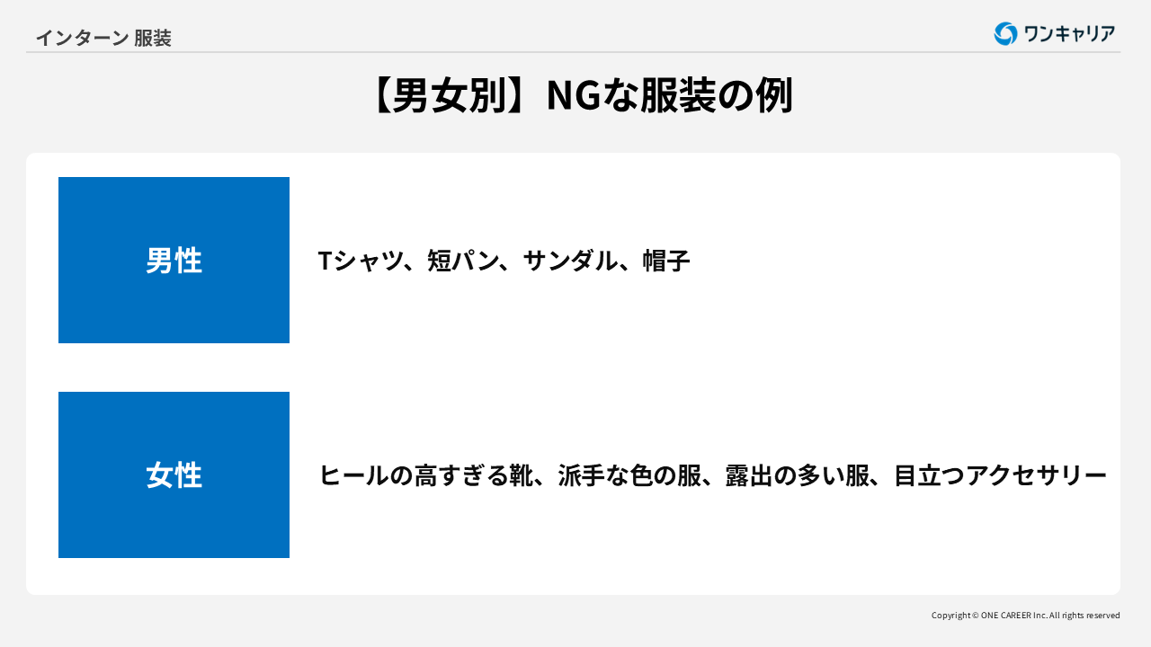 【NGな服装】 男性:Tシャツ、短パン、サンダル、帽子 女性:ヒールの高すぎる靴、派手な色の服、露出の多い服、目立つアクセサリー →「派手な色」「露出が多い」「だらしない印象を与える」服でないことが重要