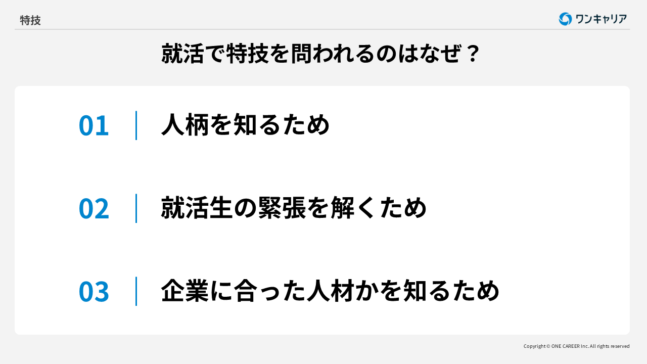 就活で特技が問われる理由は、就活生の人柄や、企業にあった人材であるかを見極めるためです。また、就活生の緊張を解きほぐすというアイスブレイクとしての意味合いもあります。