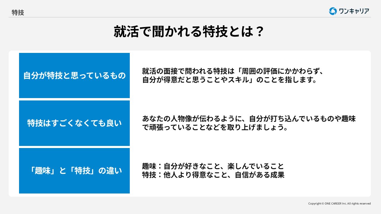 特技と聞くと、「秀でた成績や、自信が持てるものを書くべきでは」と思う人も多いでしょう。一般的には、特技は特別な技能のことを指します。しかし、就活の面接で聞かれる特技は、少し意味合いが異なります。