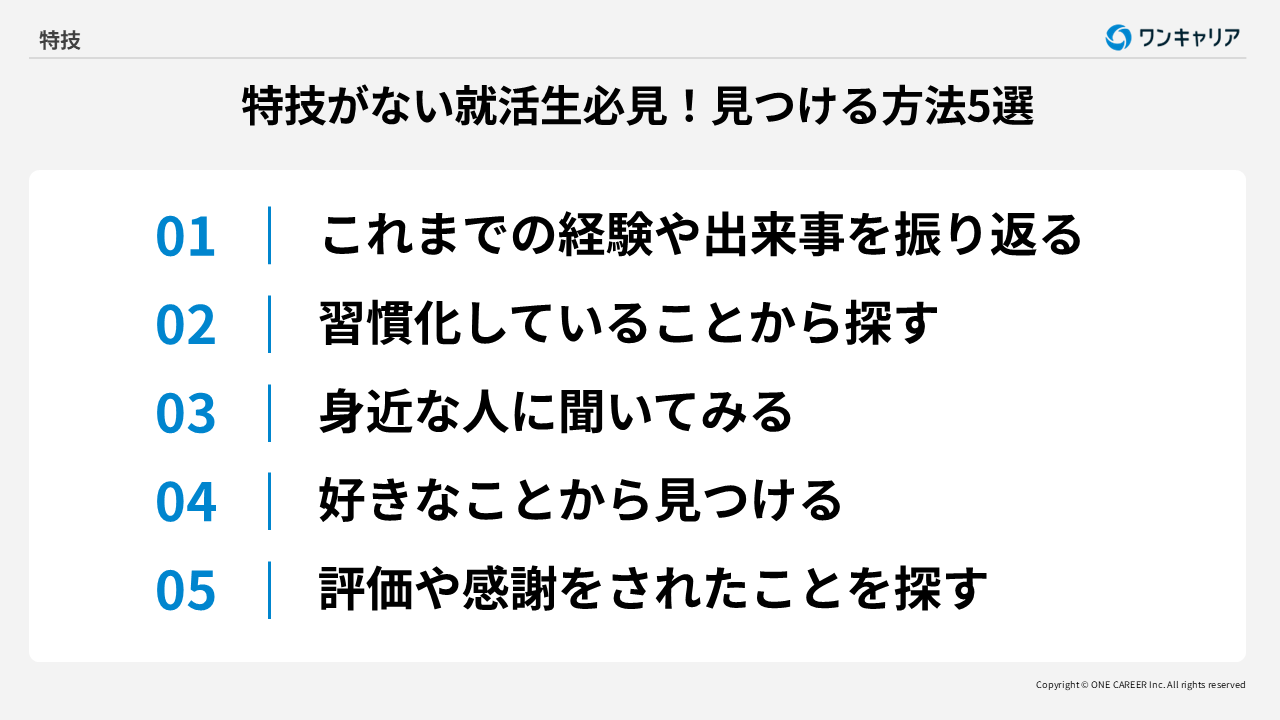 就活を進めるにあたって「自分にはアピールできる特技がない」と悩んでいる人は、まず特技を見つける方法をチェックしておきましょう。案外、特技としてアピールできることは見つかるものです。