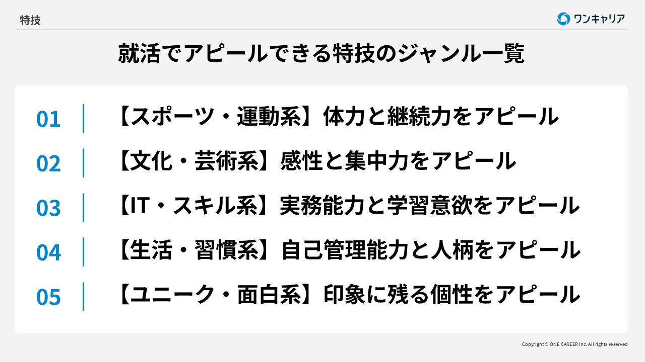 ここからは、就活でアピールできる特技の例と、その例文を紹介します。ぜひ参考にしてください。