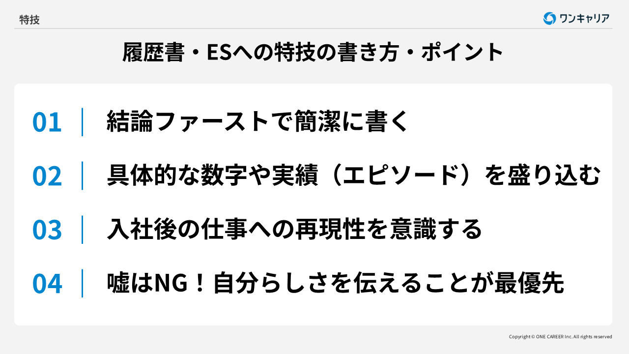 履歴書のフォーマットによっては、特技欄が1行しかない場合もあります。その際は、無理に文章にせず「箇条書き」や「体言止め」を活用して情報を凝縮させましょう。