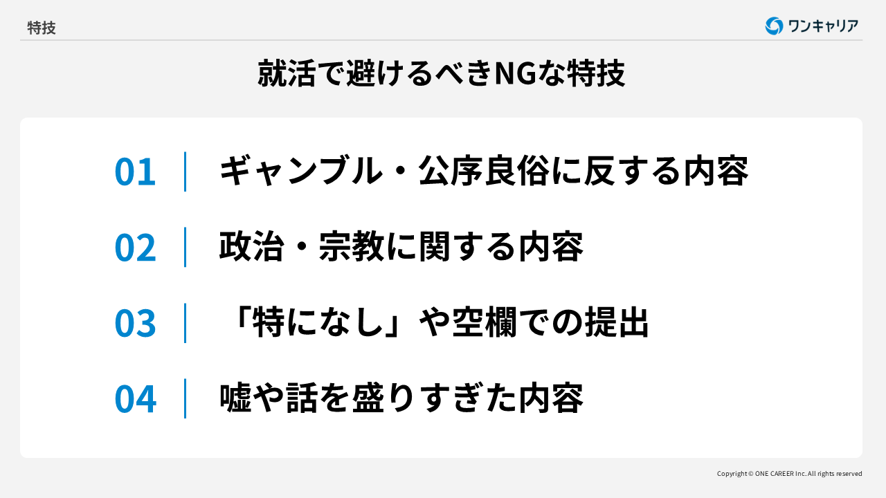特技は基本的に自由ですが、就職活動はあくまでビジネスの場です。「この人を採用して大丈夫か?」と不安を抱かせるものや、社会人としての常識を疑われるような内容は避けるのがマナーです。以下の4つのNGポイントを確認しておきましょう。