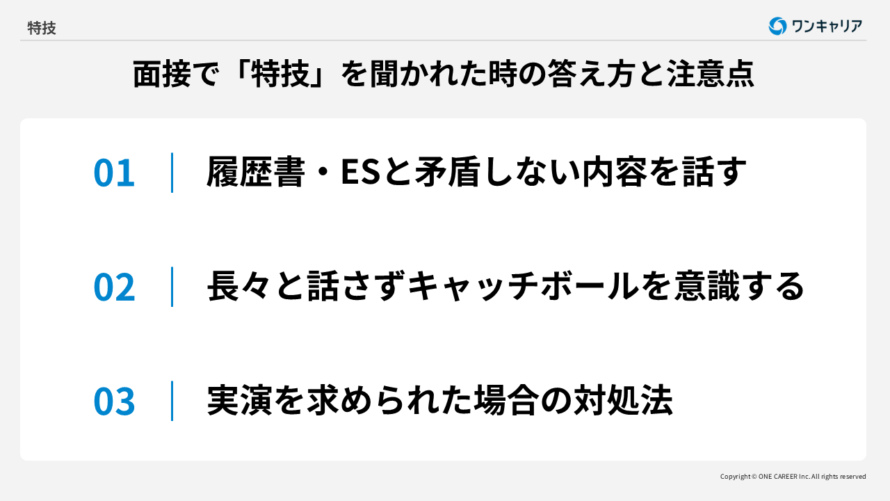 特技は自分の好きな分野であるため、つい熱が入って話しすぎてしまう人がいます。しかし、面接は演説の場ではなく、会話(キャッチボール)の場です。最初の回答は「結論+簡潔なエピソード」で1分以内(長くても40秒〜50秒程度)にまとめましょう。