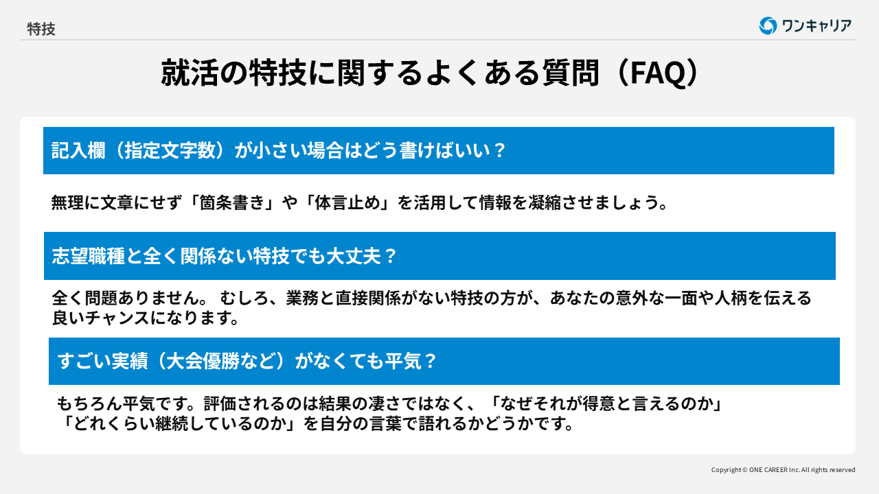 最後に、特技欄の記入について、就活生から寄せられることの多い疑問をQ&A形式でまとめました。些細な迷いを解消し、自信を持ってエントリーシートを提出できるようにしておきましょう。