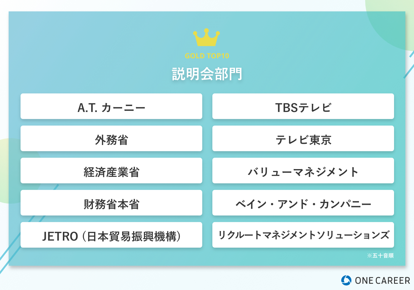 クチコミアワードは「説明会」「インターン」「本選考」の3部門に分かれている。今回はGOLD賞を受賞した各部門のTOP10社から、特筆すべきクチコミを紹介していこう。