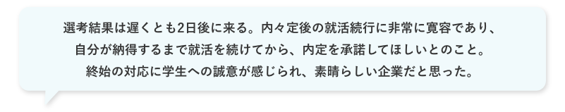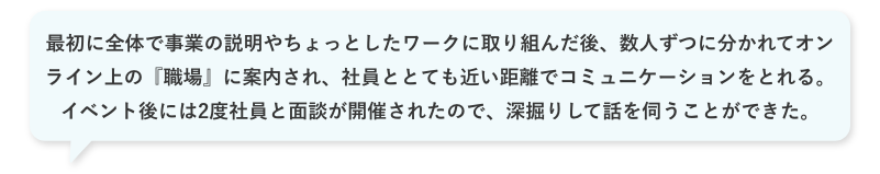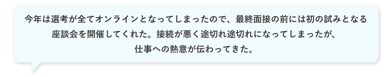 オンラインでのコミュニケーションでは「社風の伝わりにくさ」が課題として挙がりやすい。「一度も社員と会ったことがない会社でやっていけるのか」と不安に思う学生は多いはず。多少手がかかっても、コミュニケーションの機会を増やせば、入社後のミスマッチを減らすことができるだろう。