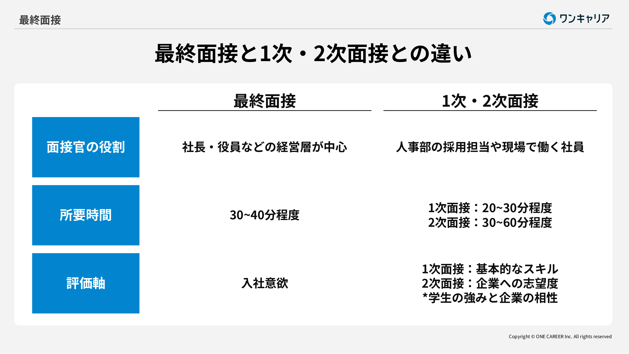 最終面接に備えるために、まずはその特徴を押さえましょう。ここでは、最終面接の面接官・所要時間・評価基準について、詳しく解説します。