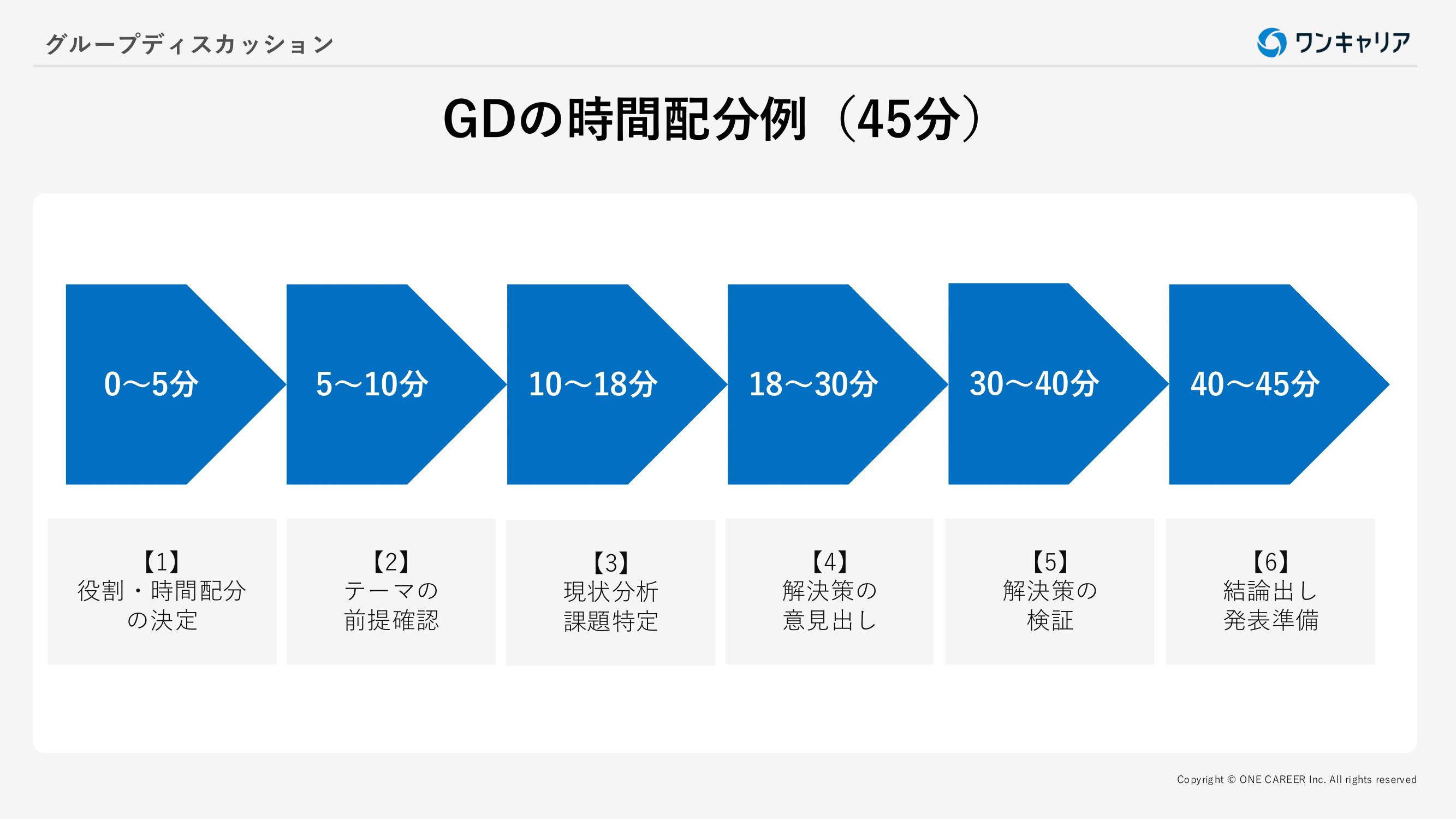 なお、実際のGDでは、テーマや参加人数に応じて最適な時間配分は変わるため、必ずしもこの例の通りに進行する必要はありません。