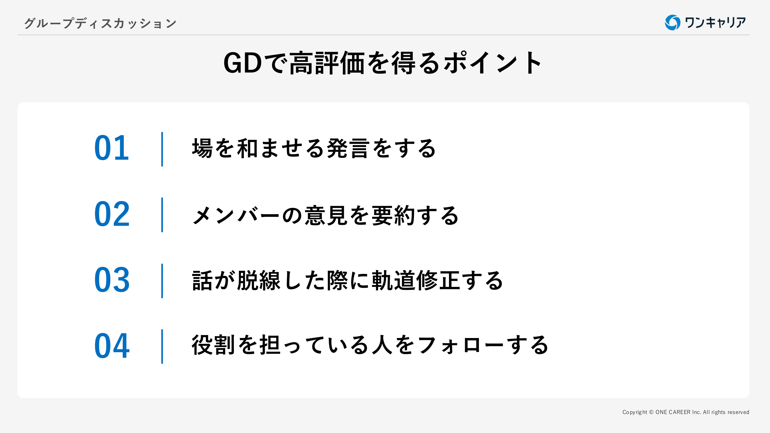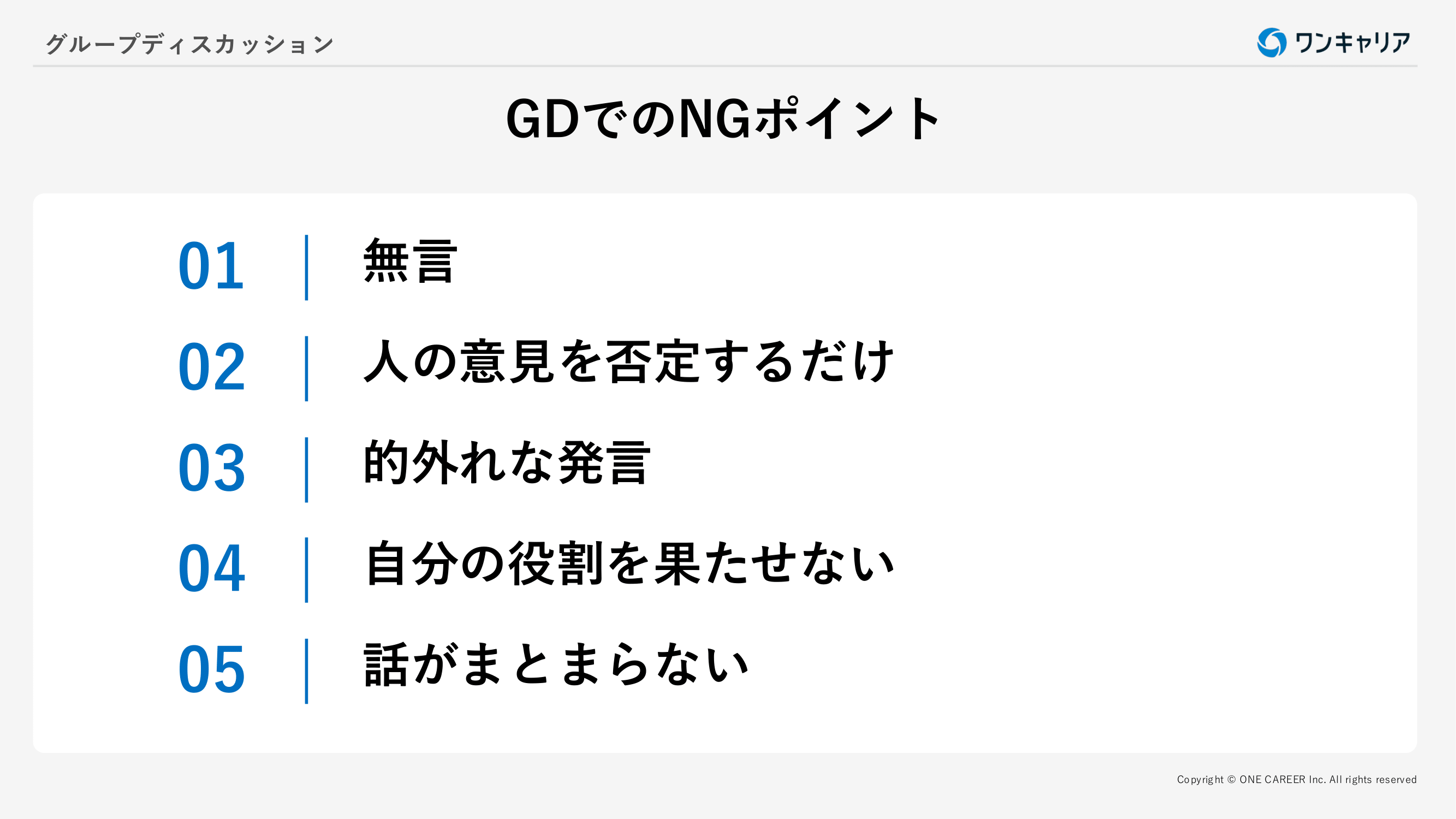 役割に関わらず、GDで意識すべきポイントと、避けるべき行動をご紹介します。