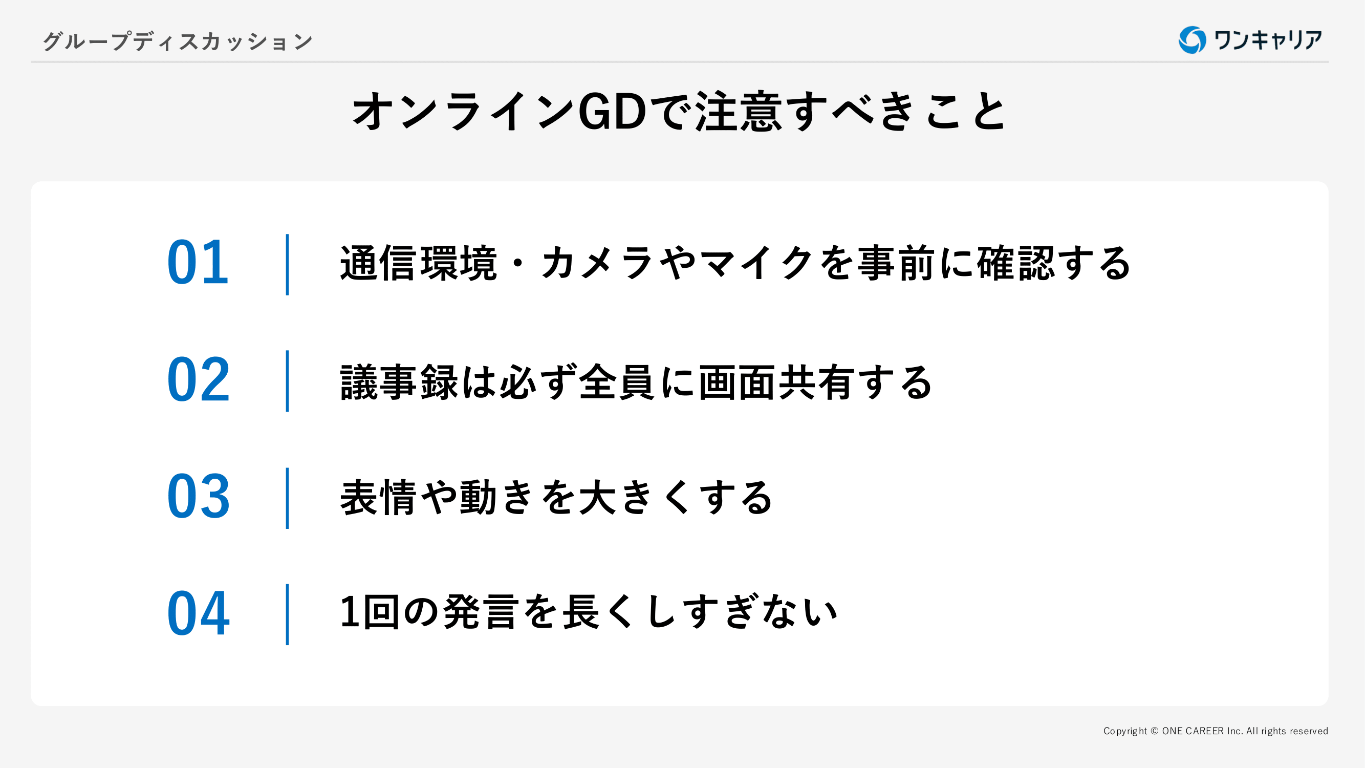 オンラインGDでは発言のタイミングが難しく、対面時よりも時間があっという間に過ぎます。一人の発言が長いと、周囲は入りづらくなります。自分が端的な発言を心がけるだけでなく、話が長いメンバーをうまくなだめることも重要です。