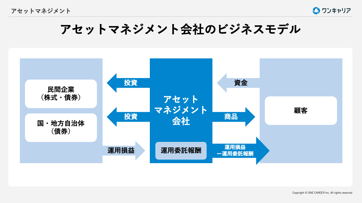 アセットマネジメント会社のビジネスモデルは、顧客の資産を運用し、その運用に対する報酬(fee)を得ることを基本としています。そのため、運用による収益がそのまま会社の利益になるのではなく、顧客に対する「運用委託報酬」が主な収益源です。