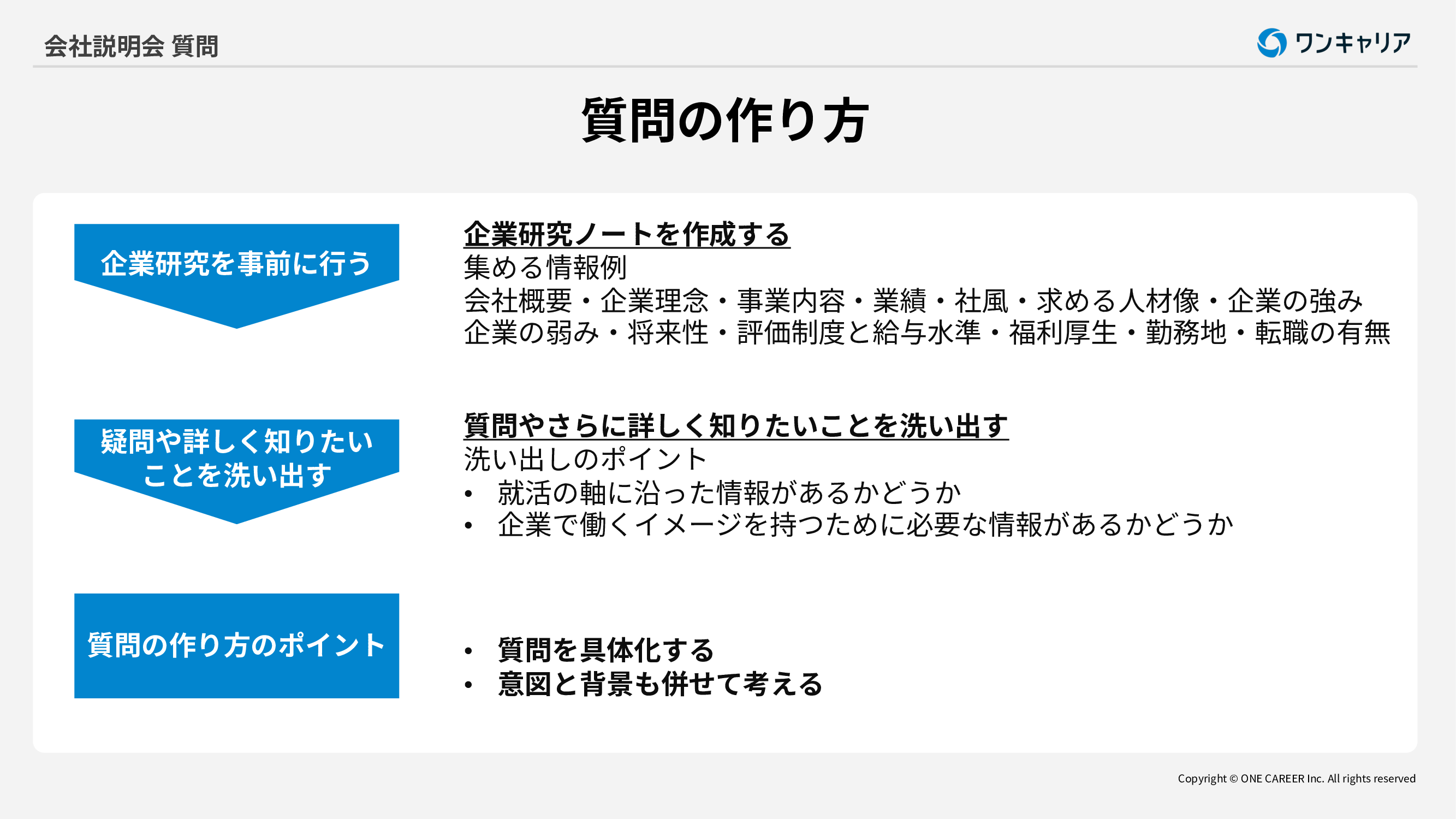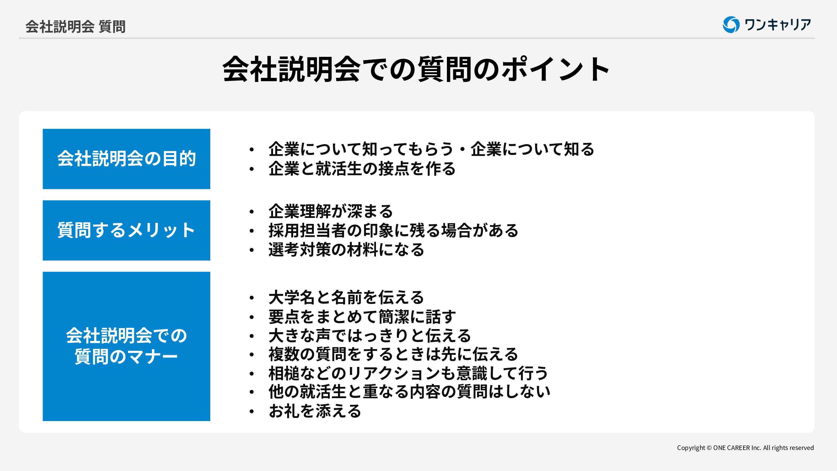 <会社説明会で質問をするメリット> ・企業理解が深まる ・採用担当者の印象に残る場合がある ・選考対策の材料になる