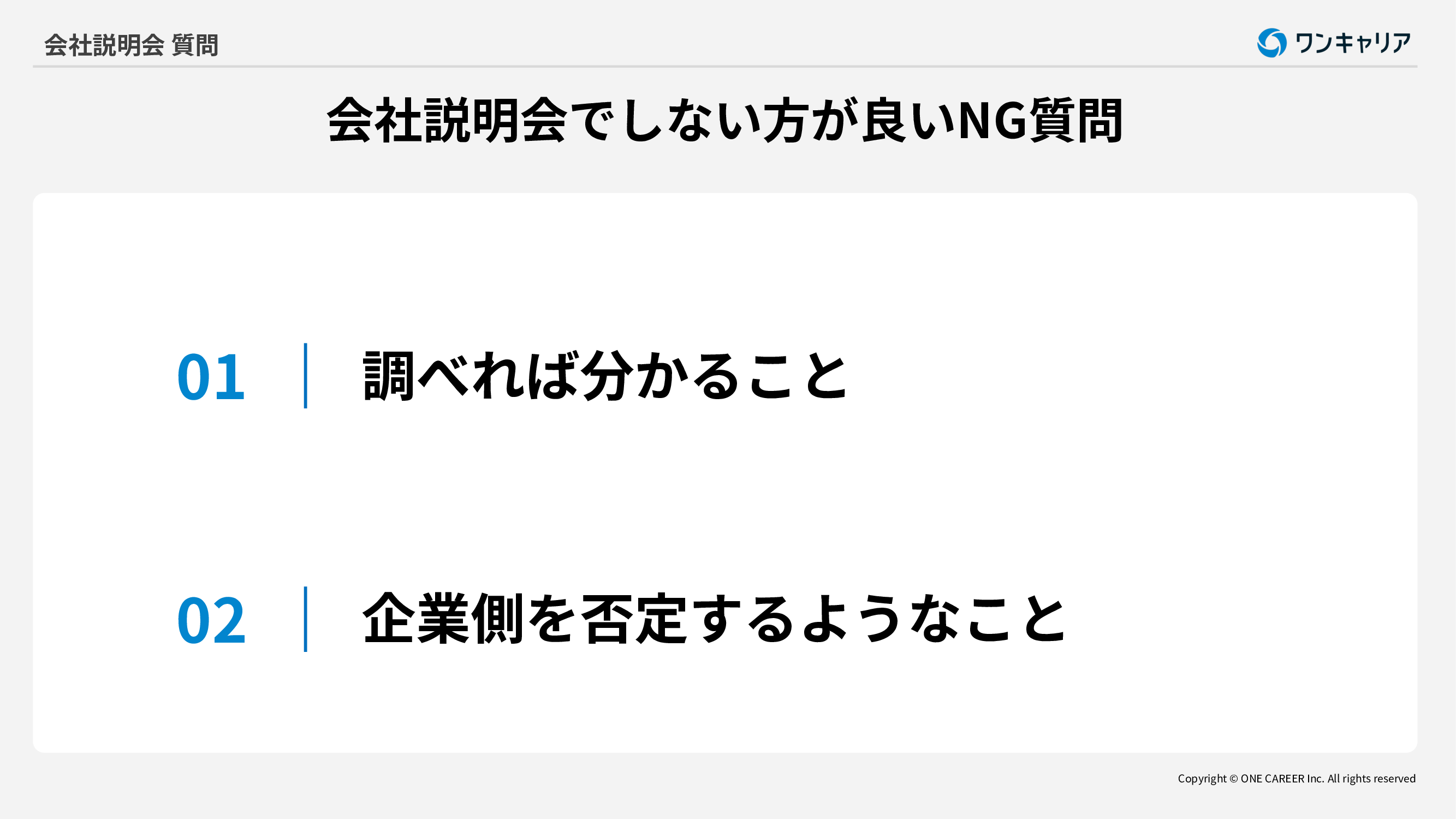<目次> ●会社説明会とは?質問した方が良い? ・会社説明会とは ・会社説明会の目的 ・質問するメリット ●会社説明会での質問例50選 ・【1】事業・サービス・商品について ・【2】業務について ・【3】求める人材について ・【4】社風・企業風土・雰囲気について ・【5】入社後のキャリアについて ・【6】福利厚生・制度について ・【7】インターンシップについて ●質問の作り方 ・企業研究を事前に行う ・疑問や詳しく知りたいことを洗い出す ・質問の作り方のポイント ●会社説明会でしない方が良いNG質問 ・調べれば分かること ・企業側を否定するようなこと ●会社説明会での質問のマナー ・大学名と名前を伝える ・要点をまとめて簡潔に話す ・大きな声ではっきりと伝える ・複数の質問をするときは先に伝える ・相槌などのリアクションも意識して行う ・他の就活生と重なる内容の質問はしない ・お礼を添える ●Web会社説明会の時のポイント ・静かな環境で質問をする ・リアクションは少し大きめを意識する ●会社説明会での質問に関するよくある質問(FAQ) ・会社説明会で、質問しないと不利になりますか? ・質問は何個くらいするのがベストですか? ・「良い質問」だと思われる質問のコツはありますか? ●まとめ