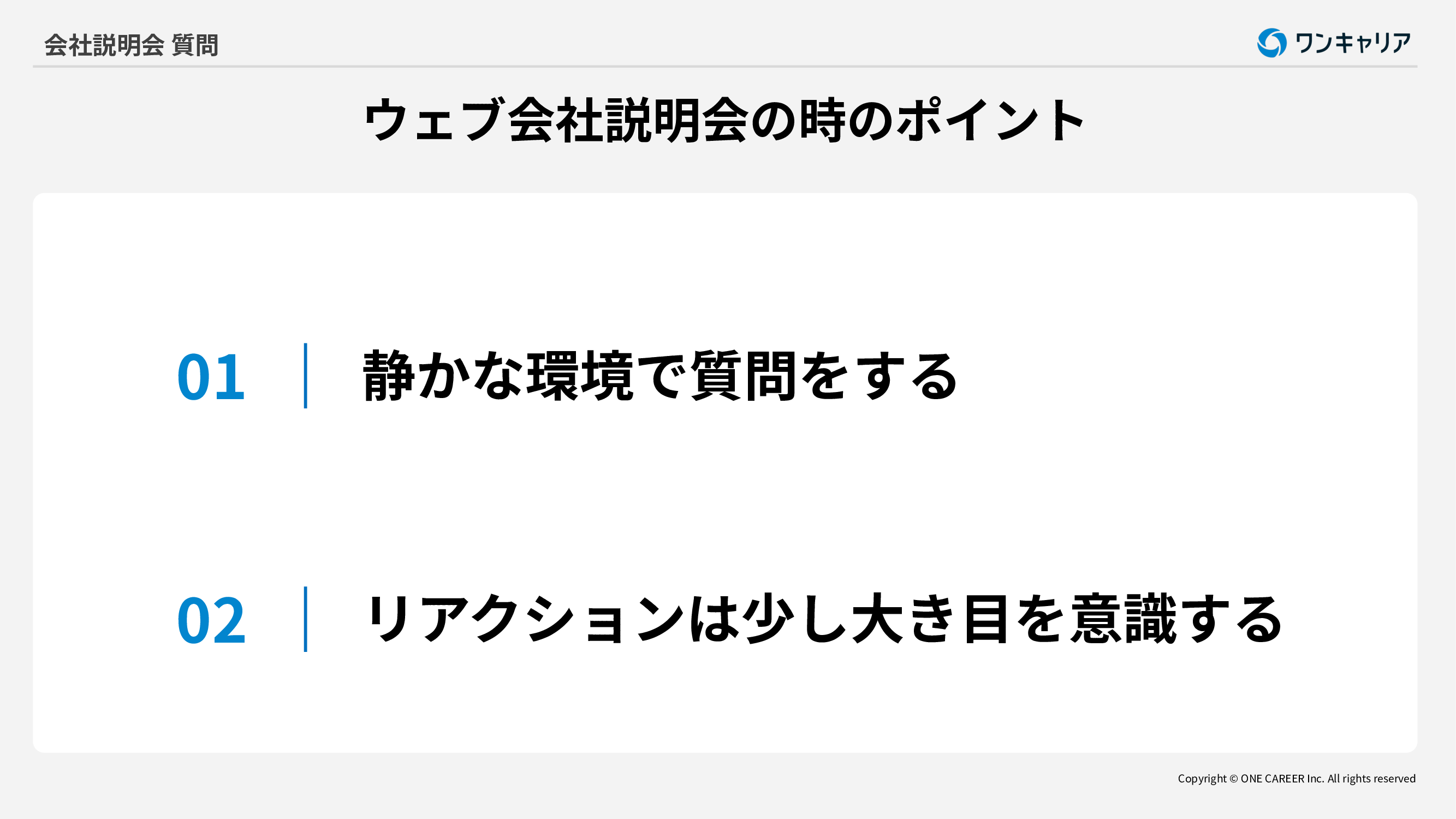 また、事前準備として質問が重なってしまった時に備えて、質問は複数個用意しておいた方が良いでしょう。