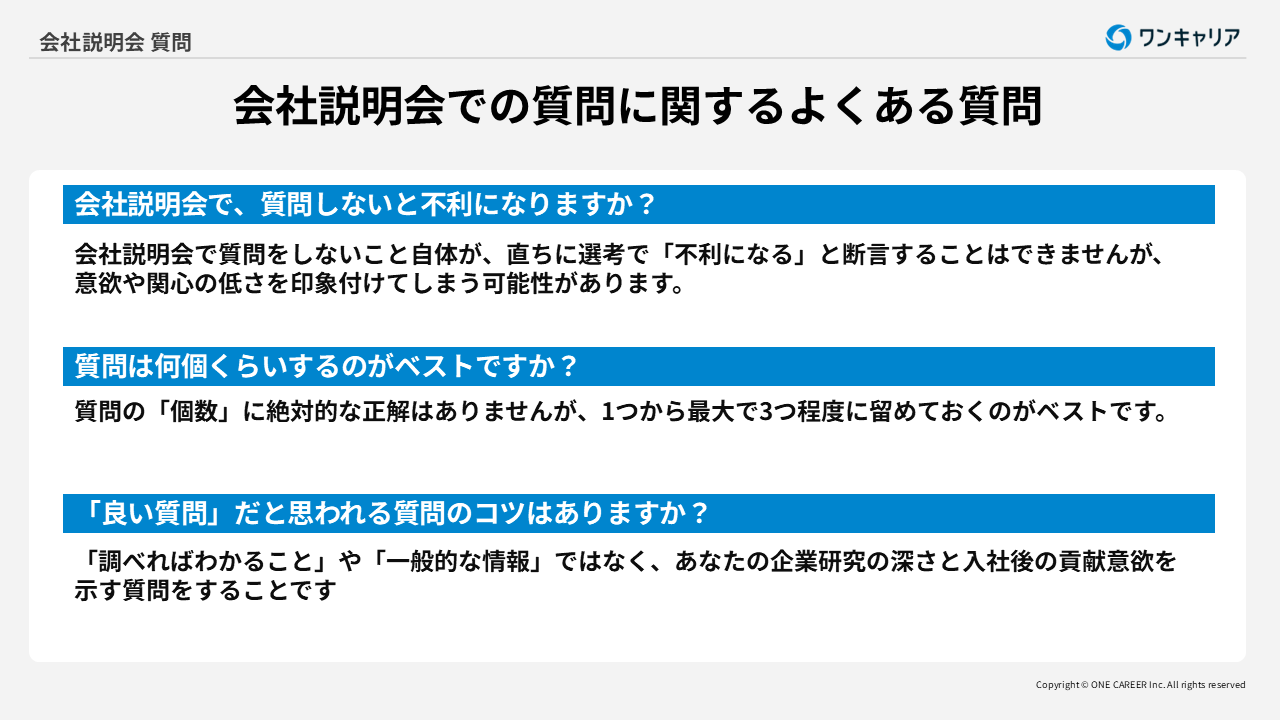 最後に、会社説明会での質問に関するよくある質問を紹介します。