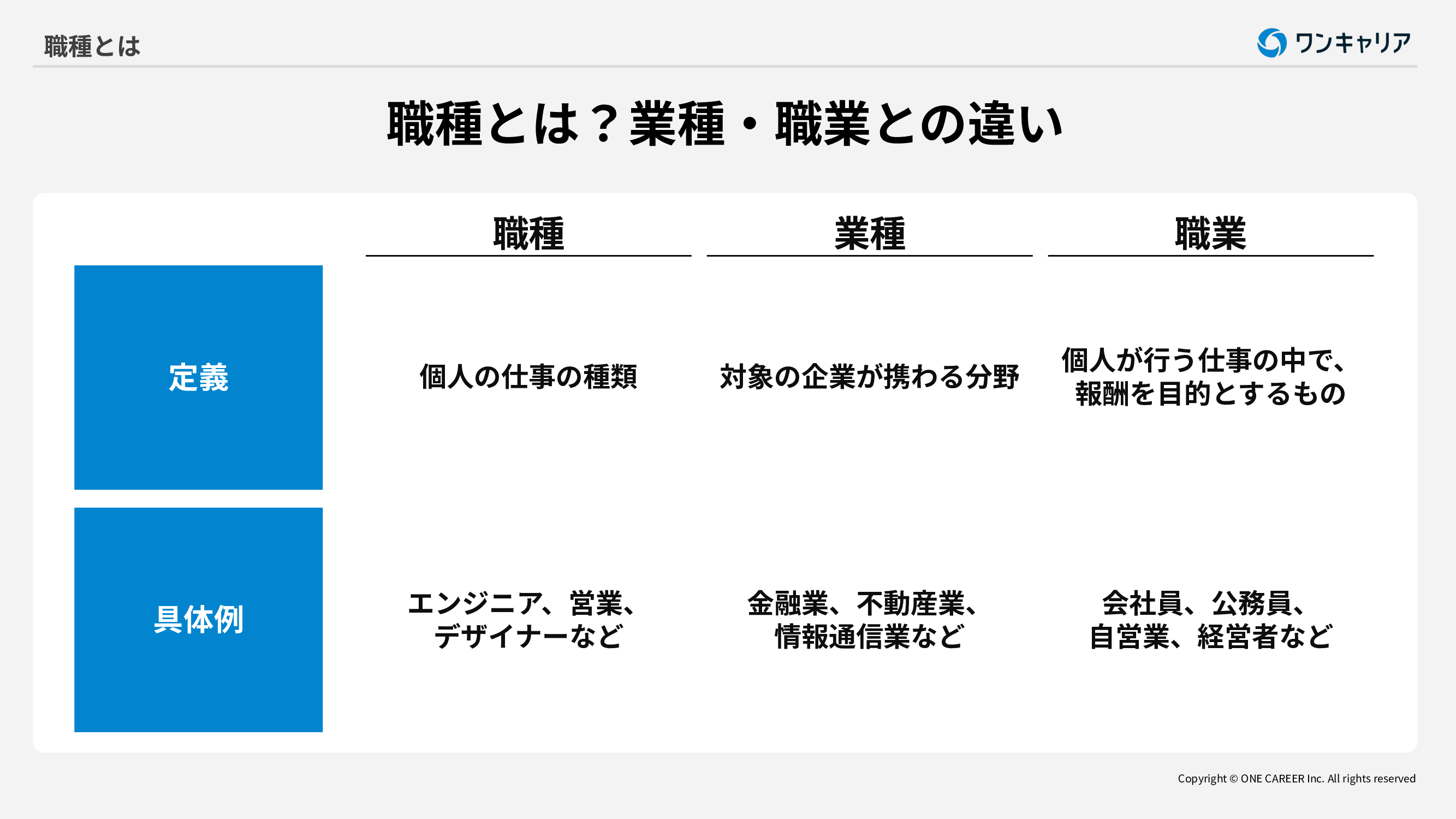 「職種」は、従事する仕事の内容や分野によって分類される概念です。