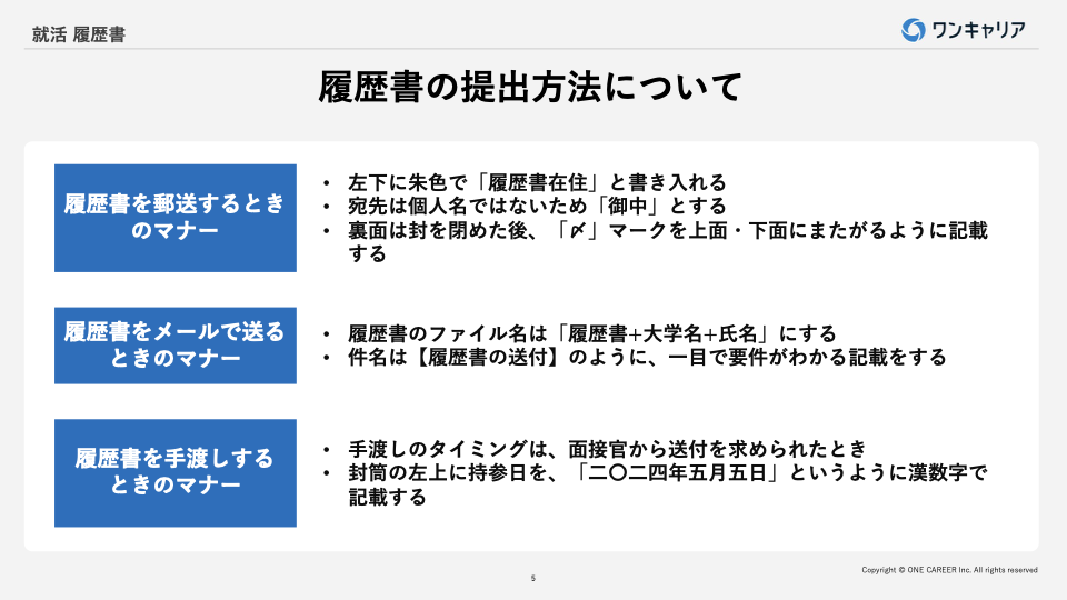 履歴書の提出方法は「郵送」「メール」「手渡し」3つの方法があり、それぞれ送付時のマナーは大きく異なることが特徴です。郵送やメールでの書類の送付は企業に入社した後、実務で担当するケースも想定されます。