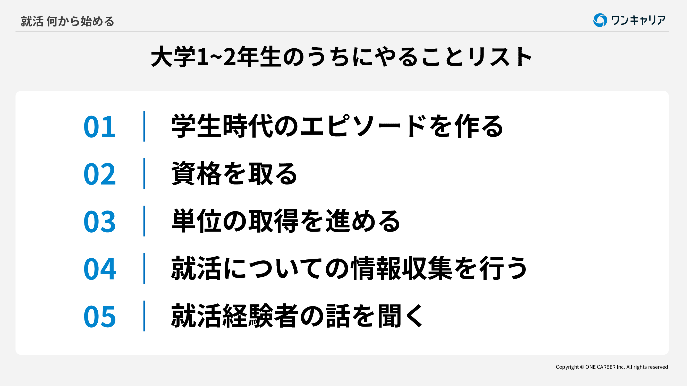 ここでは、大学1〜2年生のうちにやっておくとよいことをご紹介します。