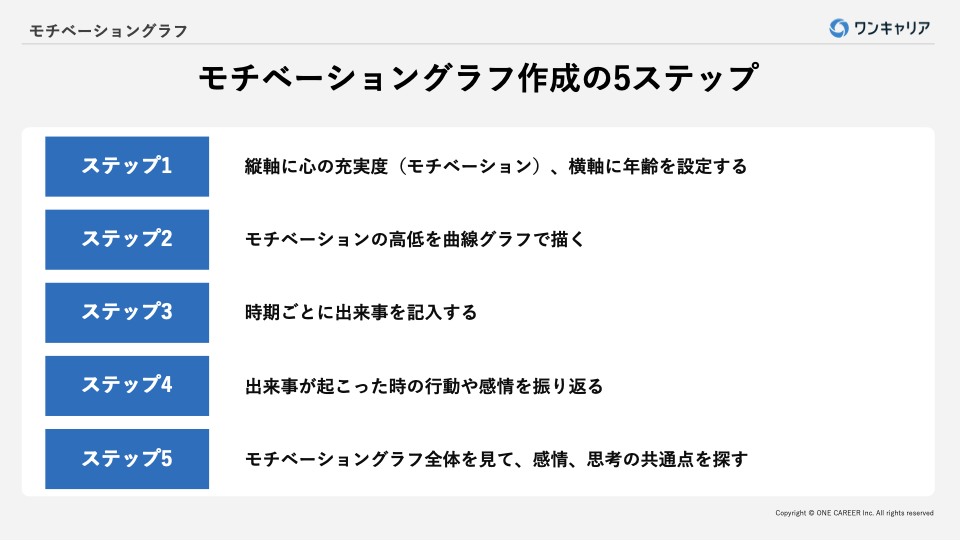 この作業は自己PRや志望動機の作成、面接にも役立ち、モチベーショングラフの作成でも特に重要な部分です。