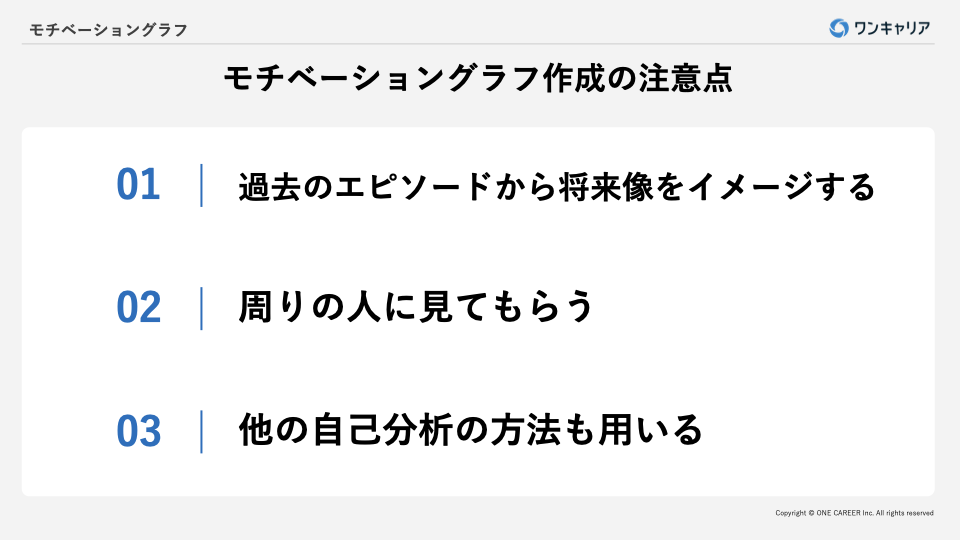 5つのステップでモチベーショングラフを作成するときは、いくつかの注意点があります。過去の振り返りだけで終わらないこと、自分だけで完結せず、周りの人に見てもらって客観的な視点で見るという点です。