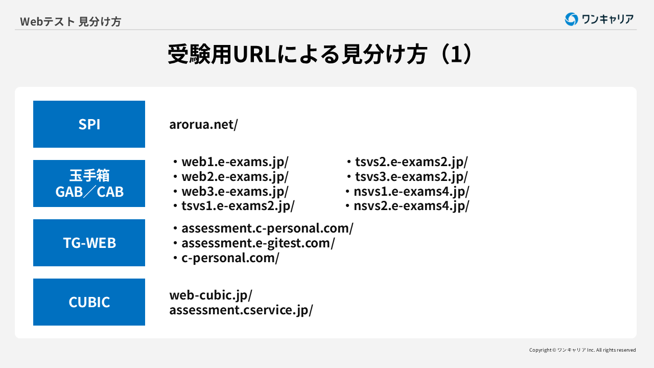 自宅でWebテストを受ける際には、こちらのURL一覧を見れば見分けられます。企業からURLが送られてきてから、実際に試験の締め切り日までは通常1週間以上あるので、その間に対策をしておくと良いです。