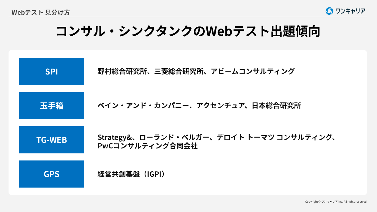 日系コンサルではSPI、外資コンサルでは玉手箱やTG-WEBが多い傾向です。