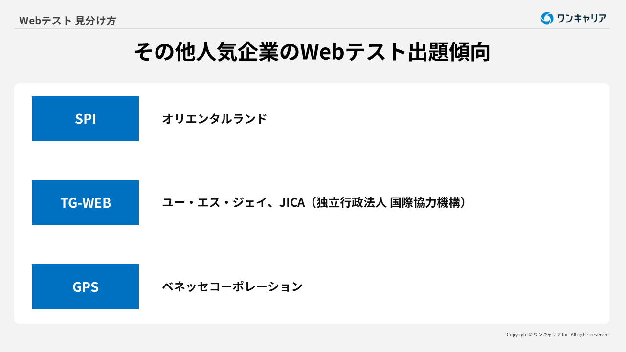・その他人気企業(オリエンタルランド、JICA、ベネッセコーポレーション)のWebテスト出題傾向