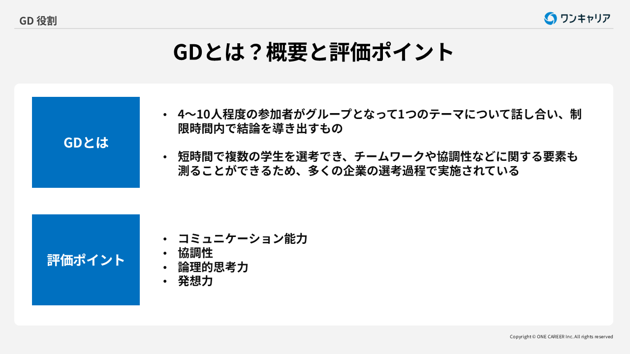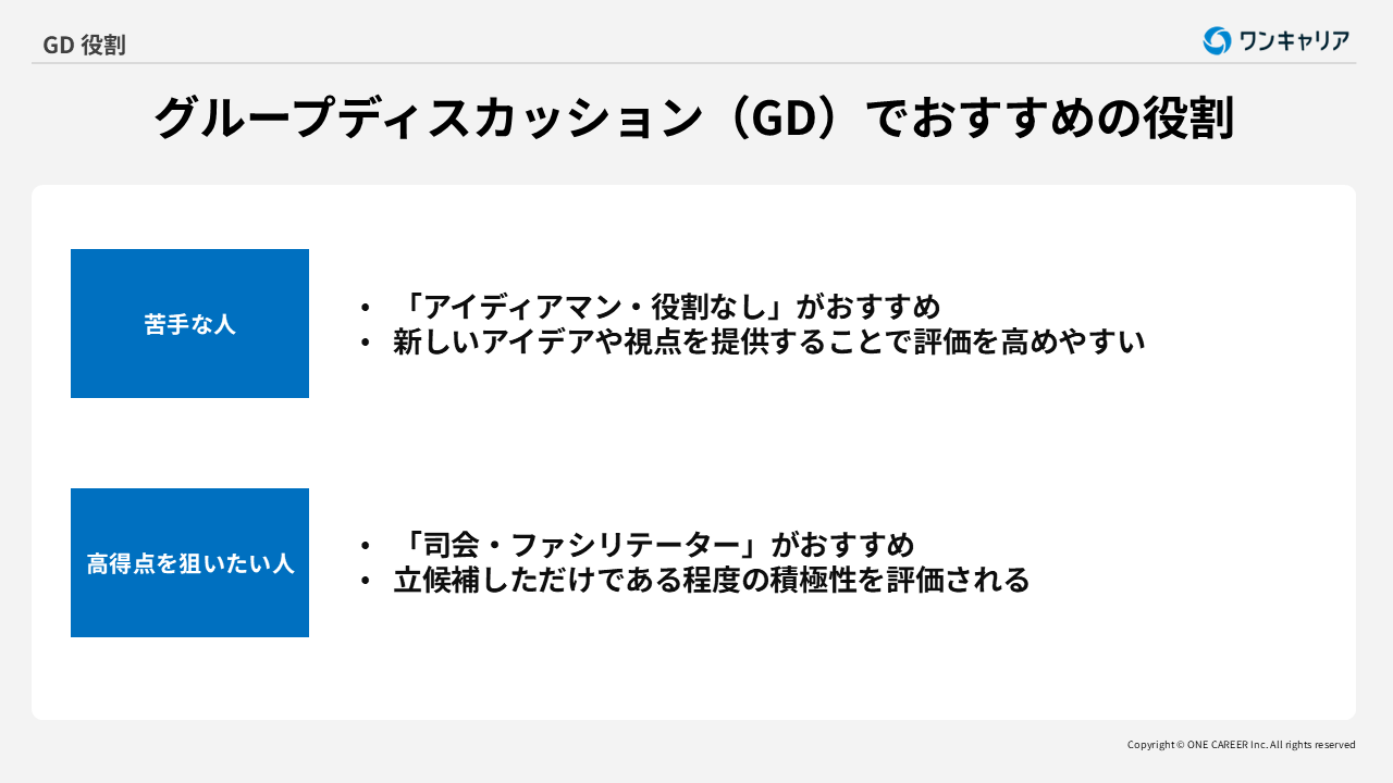 「とにかく発言量を担保すること。GDの時間が長く、お題も抽象的なので疲れてくるが、高倍率のGD選考であることを考慮すると話し続けるくらいの気概で臨んだ方がいい」
