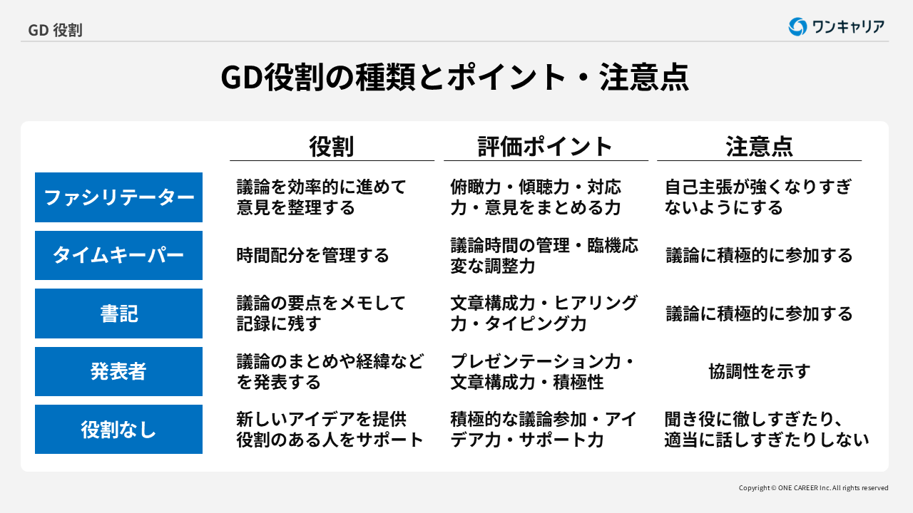 続いて、グループディスカッションの各役割の評価ポイントと注意点をご紹介します。それぞれの役割に求められる評価ポイントや注意点を知り、「役割を割り振られたときにどのような振る舞いをすればいいのか」「どんなポイントに注意して役割を全うすれば良いか」を理解していきましょう。