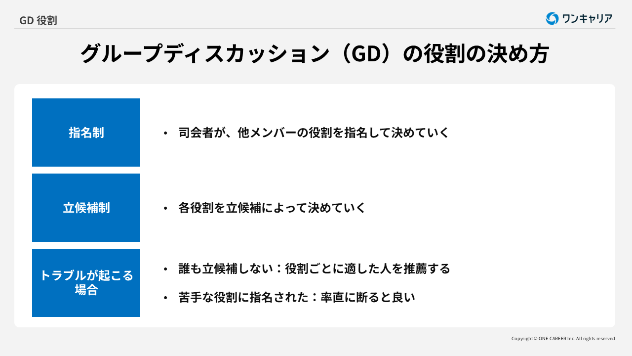 <目次> ●グループディスカッションとは ●グループディスカッション評価ポイント ●グループディスカッションにおいて役割を決める重要性 ●グループディスカッションの役割の種類 ・ファシリテーター・司会 ・タイムキーパー ・書記 ・発表者 ・アイディアマン・役割なし ●グループディスカッション役割ごとの評価ポイントと注意点 ・ファシリテーター・司会 ・タイムキーパー ・書記 ・発表者 ・アイディアマン・役割なし ●グループディスカッションでおすすめの役割 ・グループディスカッションが苦手な人 ・高得点を狙いたい人 ●グループディスカッションの役割の決め方 ・指名制 ・立候補制 ●トラブルが起きたときの対処法 ・誰も立候補しない ・苦手な役割に指名された ・役割分担でもめた ●役割に関わらず注意すべきこと ・無言 ・人の意見を否定するだけ ・的外れな発言 ・無表情 ・自分の役割を果たせない ・話がまとまらない ●グループディスカッションの事前対策 ・自己分析 ・ロジカルシンキングとコミュニケーション能力を向上させる ・ワンキャリアのグループディスカッション体験談を活用する ●まとめ