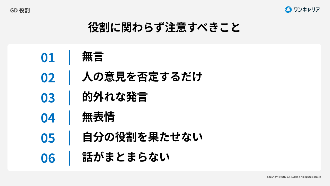 役割がないからといって、聞き役に徹しすぎたり、適当に話しすぎたりしないようにしましょう。また、他のメンバーのサポートをしながらグループの足りない部分を補い、積極的に議論に参加することが求められます。