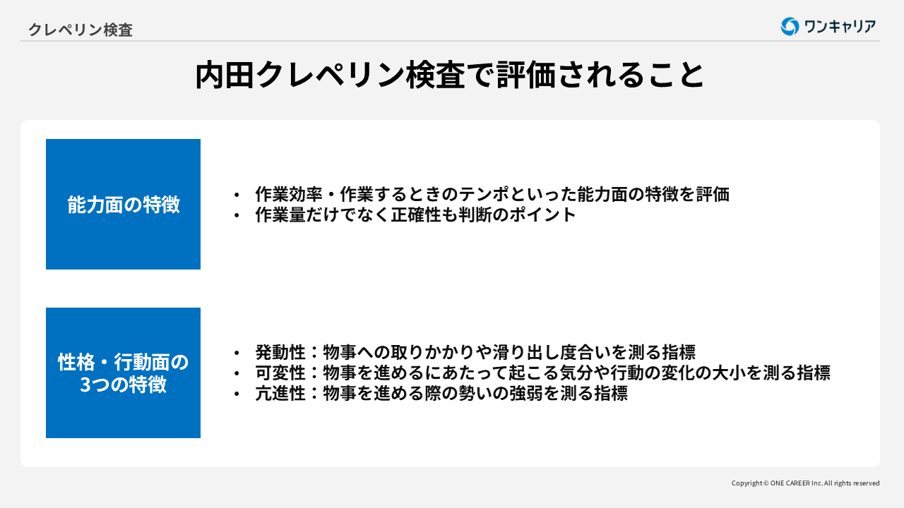 内田クレペリン検査で評価されるのは、「能力面の特徴」と「性格・行動面の特徴」です。「能力面の特徴」では、受検者が与えられた作業をどれだけ早く・効率良く処理できるかを測ります。