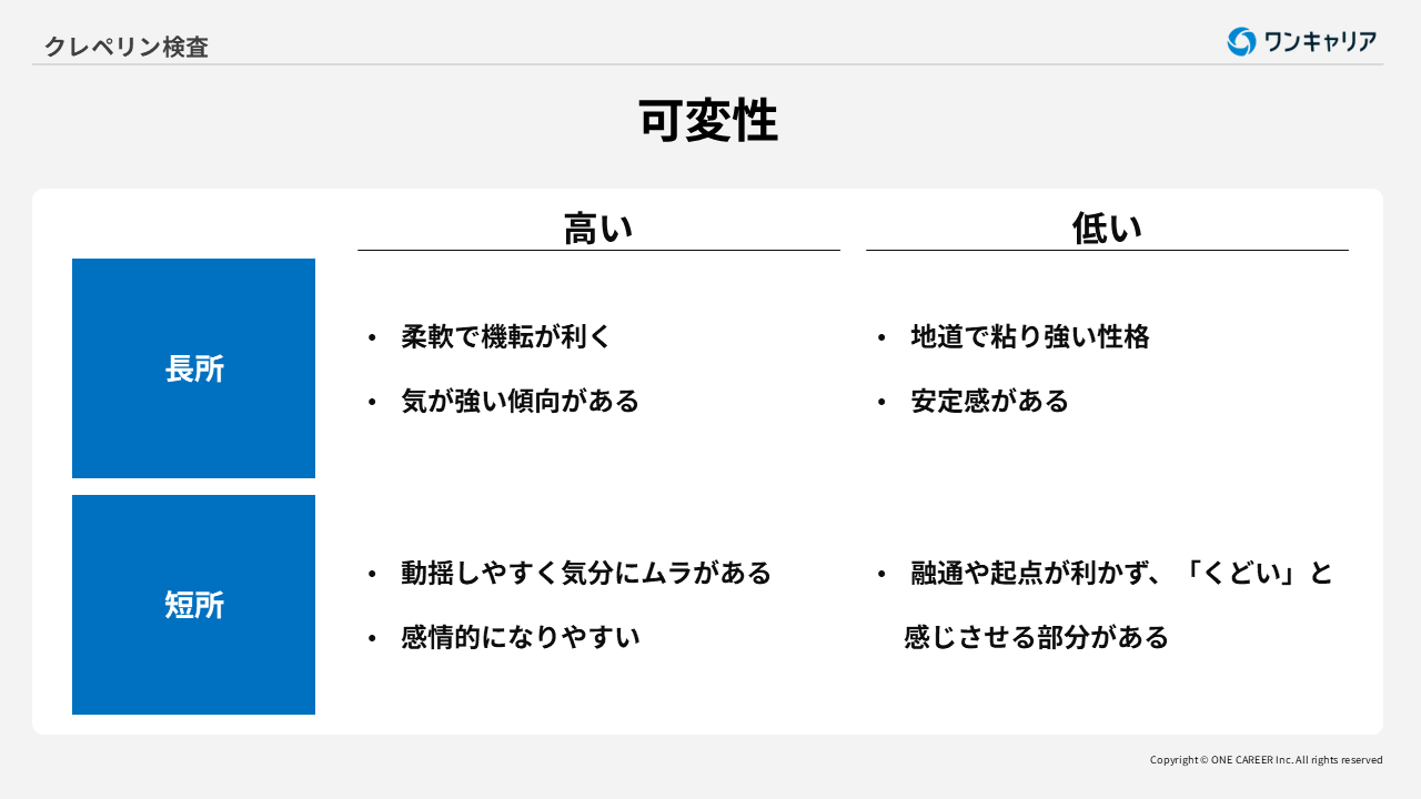 可変性とは、物事を進めるにあたって起こる気分や行動の変化の大小を測る指標です。可変性の高低で、次のような長所・短所がわかります。