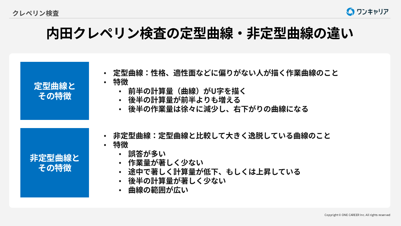 内田クレペリン検査の判定材料の1つである作業曲線には、定型曲線と非定型曲線という2つのパターンがあります。定型曲線は検査基準の1つであり、大幅にかけ離れた曲線は非定型曲線として、能力・適性面で偏りがあるとみなされてしまいます。