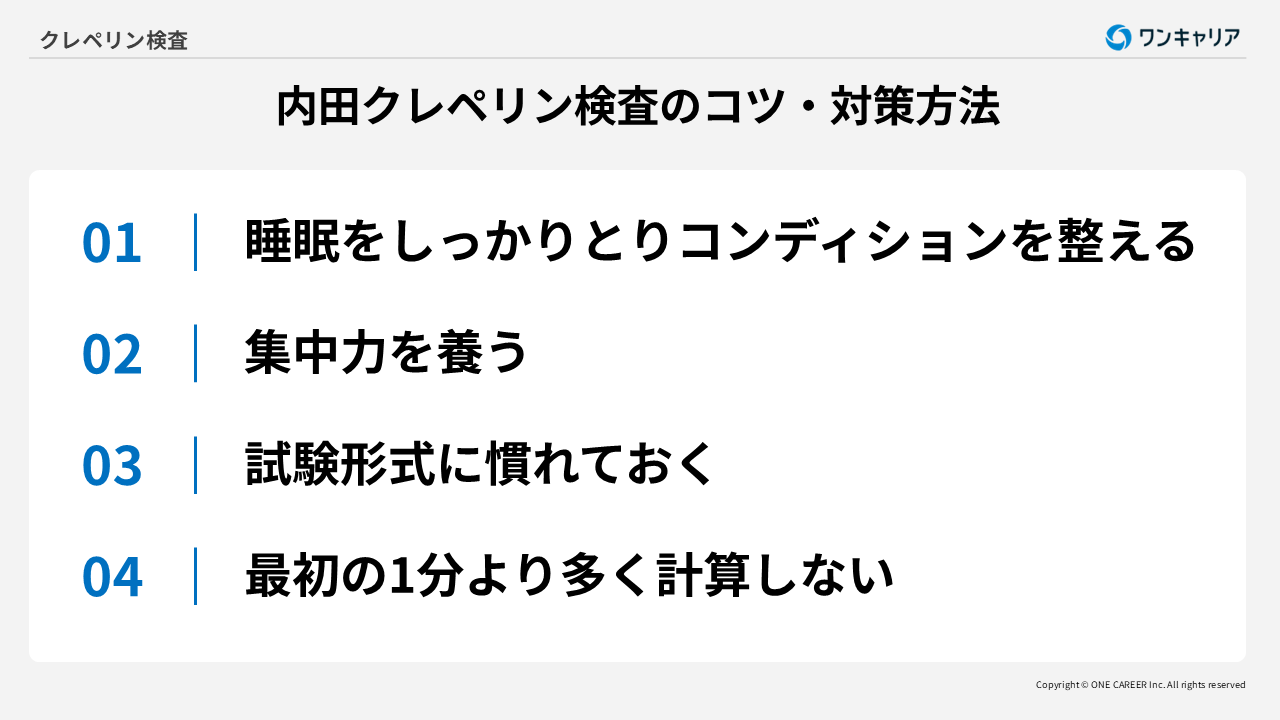 内田クレペリン検査のコツ・対策方法は以下4つです。