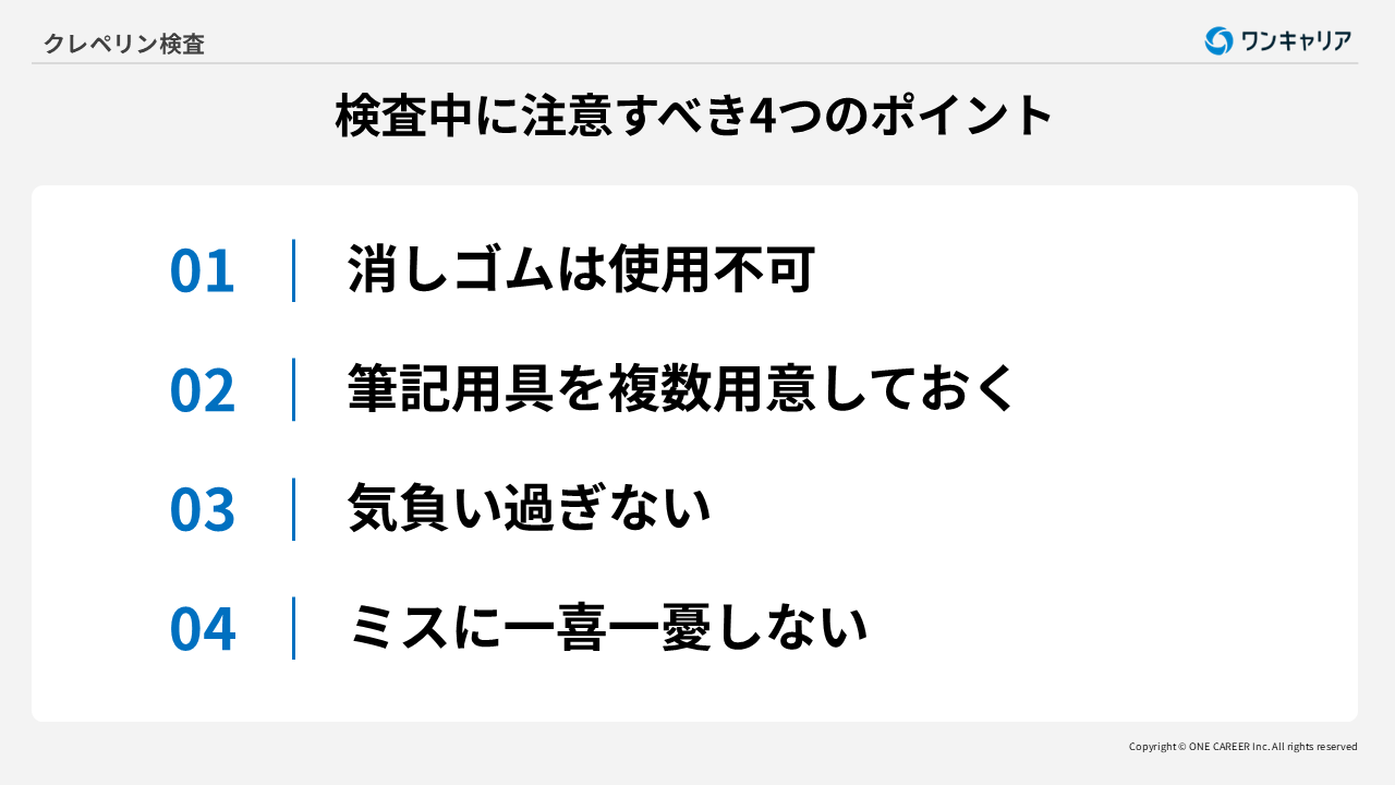 検査中は計算に集中し、ミスに一喜一憂しないことが大切です。ミスをすると気になるかもしれませんが、そこで落ち込んでいては集中力が落ちる原因になります。