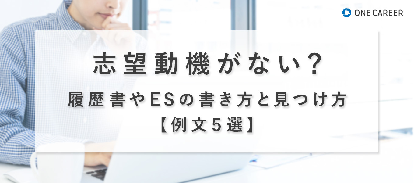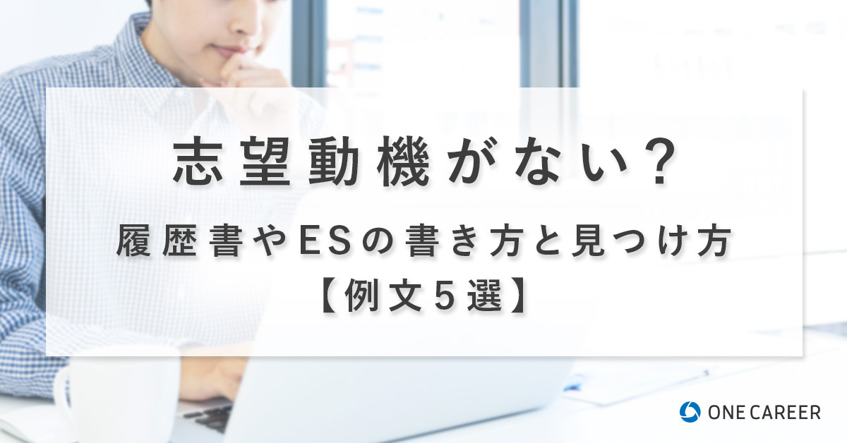 <目次> ●履歴書を書く際に志望動機が思いつかない理由 ・自分がやりたいことと、将来のキャリアプランが明確でない ・企業の文化・仕事内容を把握できていない ・自己分析や企業分析は対策したが、自分と企業の接点が見いだせていない ●志望動機がない時の見つけ方 ・自己分析 ・企業分析 ・ONE CAREER体験談を活用して他人の志望動機の内容を参考にする ●志望動機がない時に企業側の意図から考えよう ・なぜうちの会社? ・自社に入ったら何ができる? ●志望動機を作り上げるフォーマット ・会社が「お金儲けしている分野」を知る ・自分が「お金を稼げる分野」を知る ・企業が仕事で求めるスキルと、自分が持つエピソードを合体させる ●志望動機を書く際のポイント ・結論から伝える ・エピソードを添える ・企業で生かせるポイントを伝える ●【職種別】志望動機の例文 ・コンサルタント ・研究・開発職 ・エンジニア ・事務・総合職 ・営業職 ●志望動機の注意点 ・具体性がないエピソードを使わない ・誇張しすぎるエピソードを書かない ・社風・仕事内容に合うエピソードを選ぶ ・入社後にどのように活躍したいかを伝える ・給与・待遇に関する内容を書かない ・話し言葉を使わない ・大きな余白はないように ・誤字・脱字に注意する ●まとめ