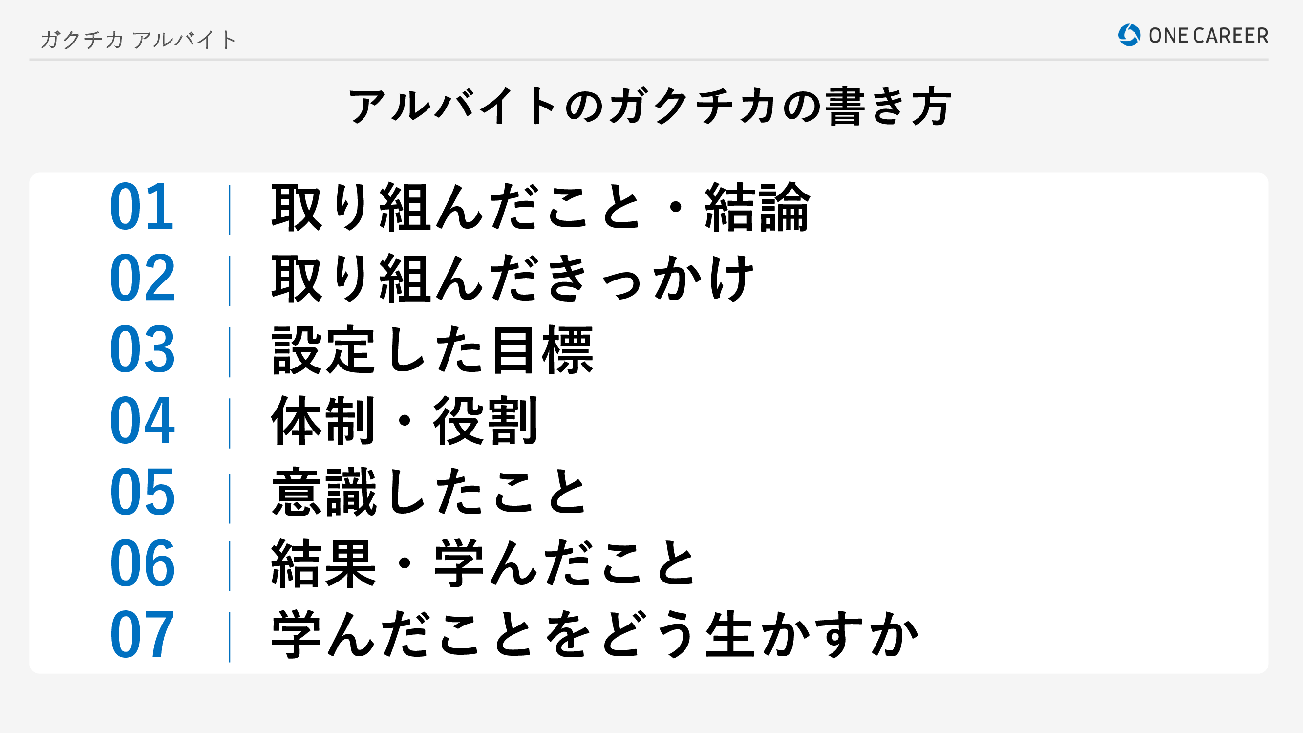 ガクチカでアルバイトを書くときには、基本的に以下の7つのステップを意識した方が、面接官により説得力のあるガクチカを書くことができます。