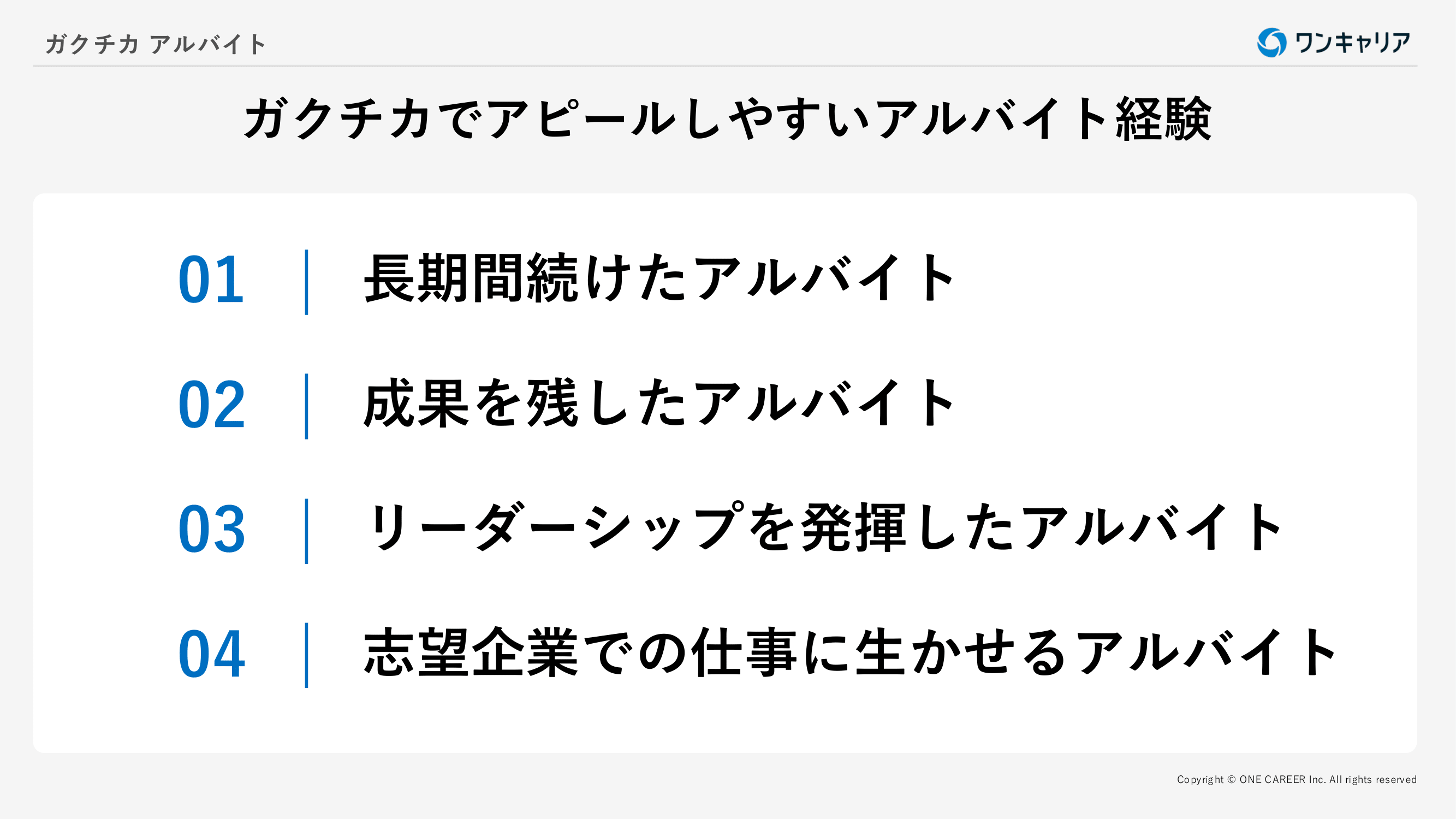 長期間同じアルバイトを続けていた経験は、ガクチカでアピールしやすいアルバイト経験の1つです。