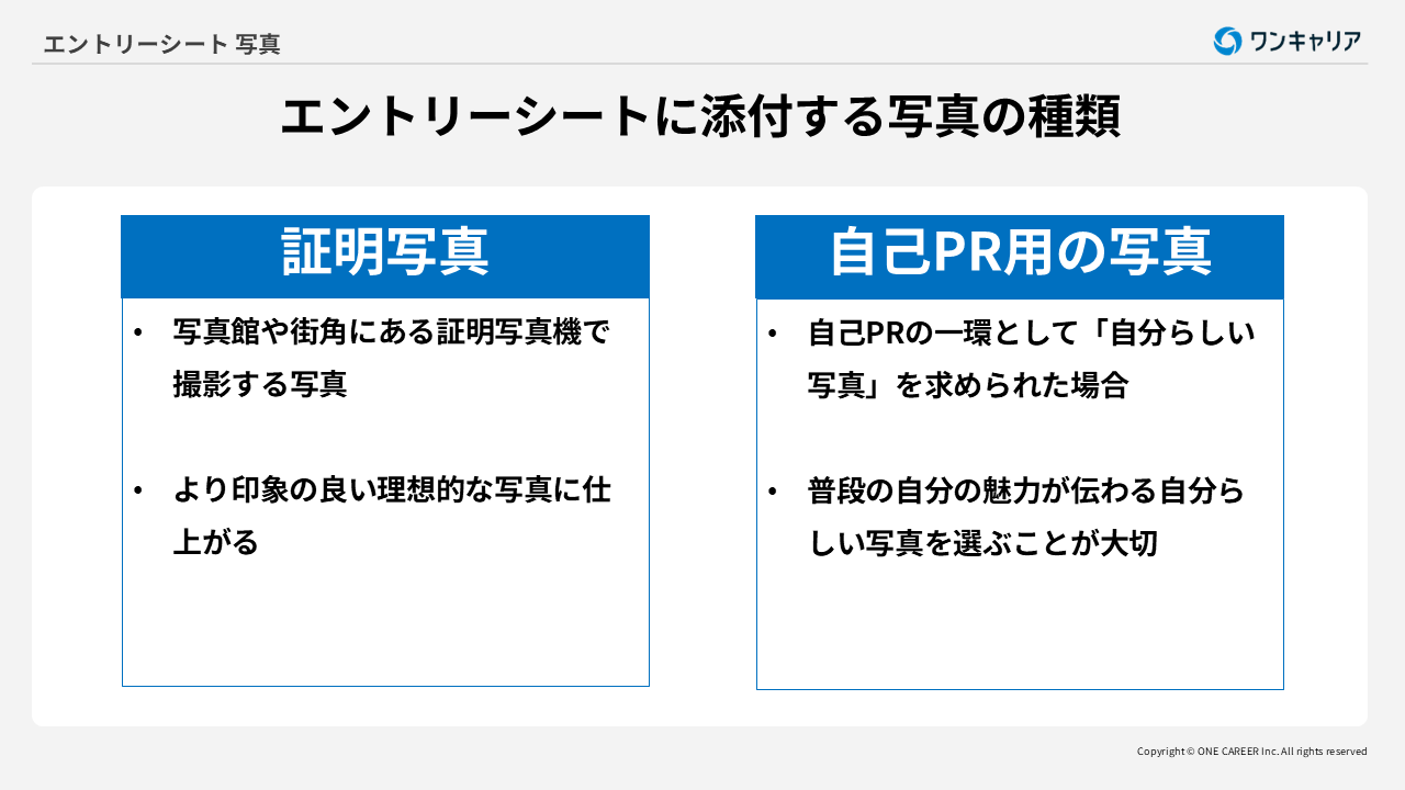 <目次> ●エントリーシートに添付する写真の種類 ・証明写真 ・自己PR用の写真 ●エントリーシートの証明写真の目的 ・本人確認の確認 ・第一印象を確認するため ●エントリーシートの写真に関する基本ルール・準備 ・エントリーシート提出の3カ月以内に撮影する ・写真は20~30枚用意する ・エントリーシートの写真サイズ:「縦40mm×横30mm」が一般的 ●エントリーシート用の証明写真はどこで撮れば良い? スマホを使う方法も解説 ・写真館 ・スピード写真 ・自宅 ●エントリーシート用の証明写真撮影時の身だしなみ ・エントリーシート写真の服装について・スーツではないとだめ? ・エントリーシート写真の髪形について ・エントリーシート写真のメイクについて ●エントリーシートの証明写真で好印象を残すポイント ・ふさわしい背景色で撮影できる場所を選ぶ ・姿勢を正して背筋を伸ばす ・口角を少しだけ上げる ・前髪が目にかからないようにする ・補正機能を使う ●エントリーシートの自己PR用写真の例 ・活発さが分かる写真 ・誠実さが分かる写真 ・クリエイティブさが分かる写真 ●エントリーシートの自己PR用の写真を選ぶコツ ・自分らしく映っている写真を選ぶ ・自己PRにつながる写真を選ぶ ●エントリーシートに写真を添付する方法・紙編 ・1. 写真をハサミで丁寧に切る ・2. 写真の裏に油性ペンで大学名・氏名を書く ・3. 枠からはみ出さないようまっすぐ貼る ●エントリーシートに写真を添付する方法・WEB編 ・1. 写真をデータ化する ・2. パソコンやスマホに写真を取り込む ・3. WEBのエントリーシートにアップロードする ●まとめ