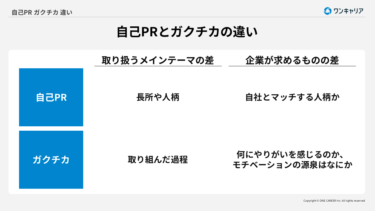 自己PRとガクチカの違いが分からないという方も多いと思いますが、この2つは伝える内容に大きな違いがあります。