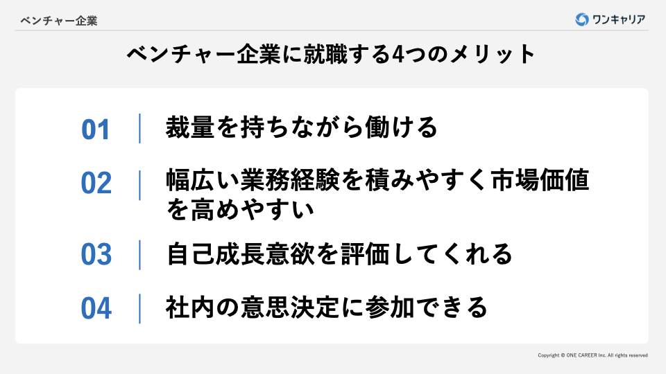 ここでは、ベンチャー企業に就職することのメリットを4つのポイントに分けて詳しく解説します。ポイントごとにベンチャー企業で働くことの具体的なメリットを深掘りします。