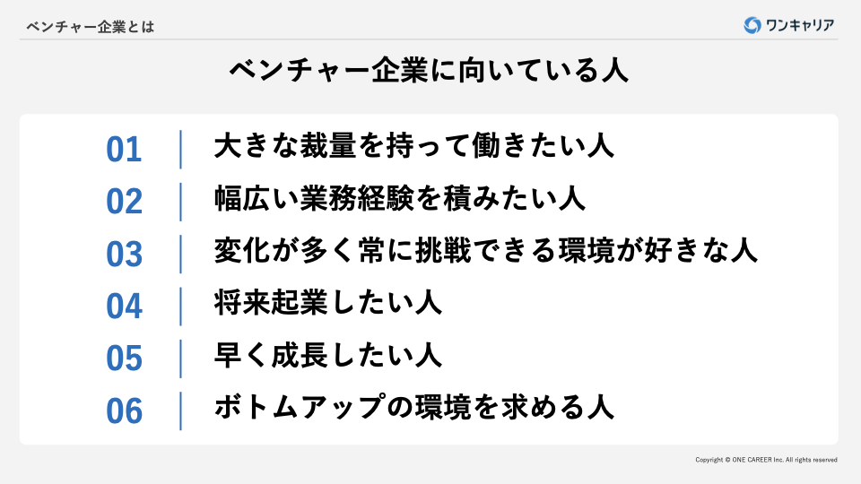 ベンチャー企業は、自分のアイデアや意見を積極的に発信し、それを実行に移す機会が多い環境で働きたい人には最適です。企業が迅速な意思決定や革新を求めるために、各社員が自分の役割において自主的に判断し行動することが期待されることが理由です。