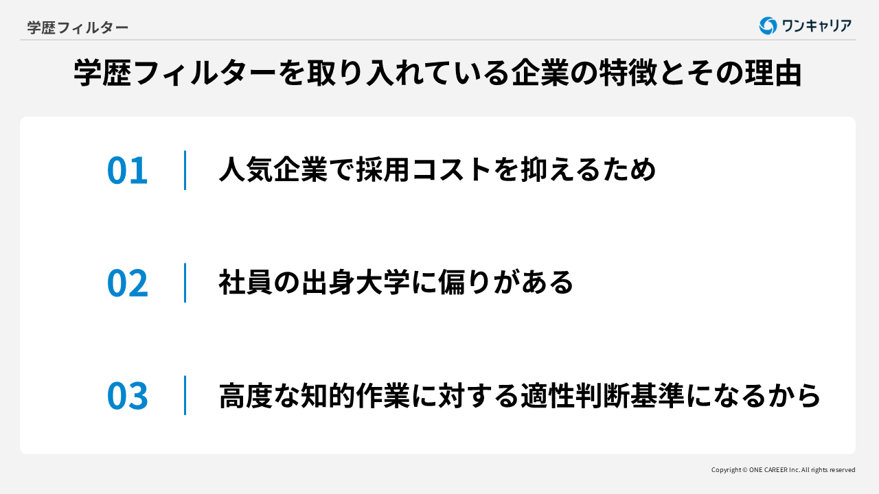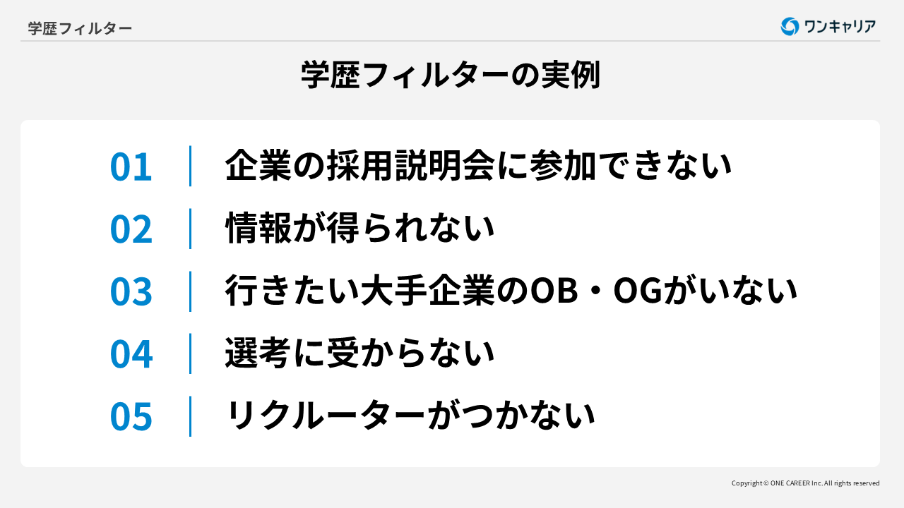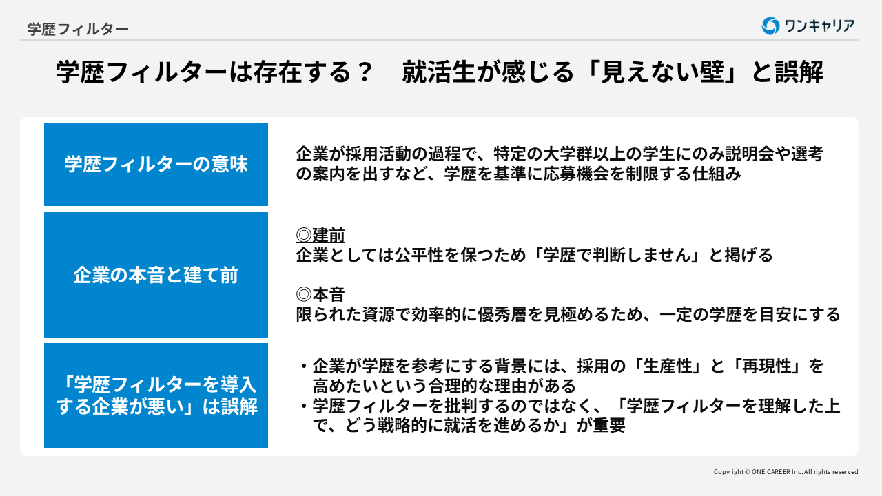 学歴フィルターの不平等が多くの学生にとって大きな障壁になっているといえるでしょう。